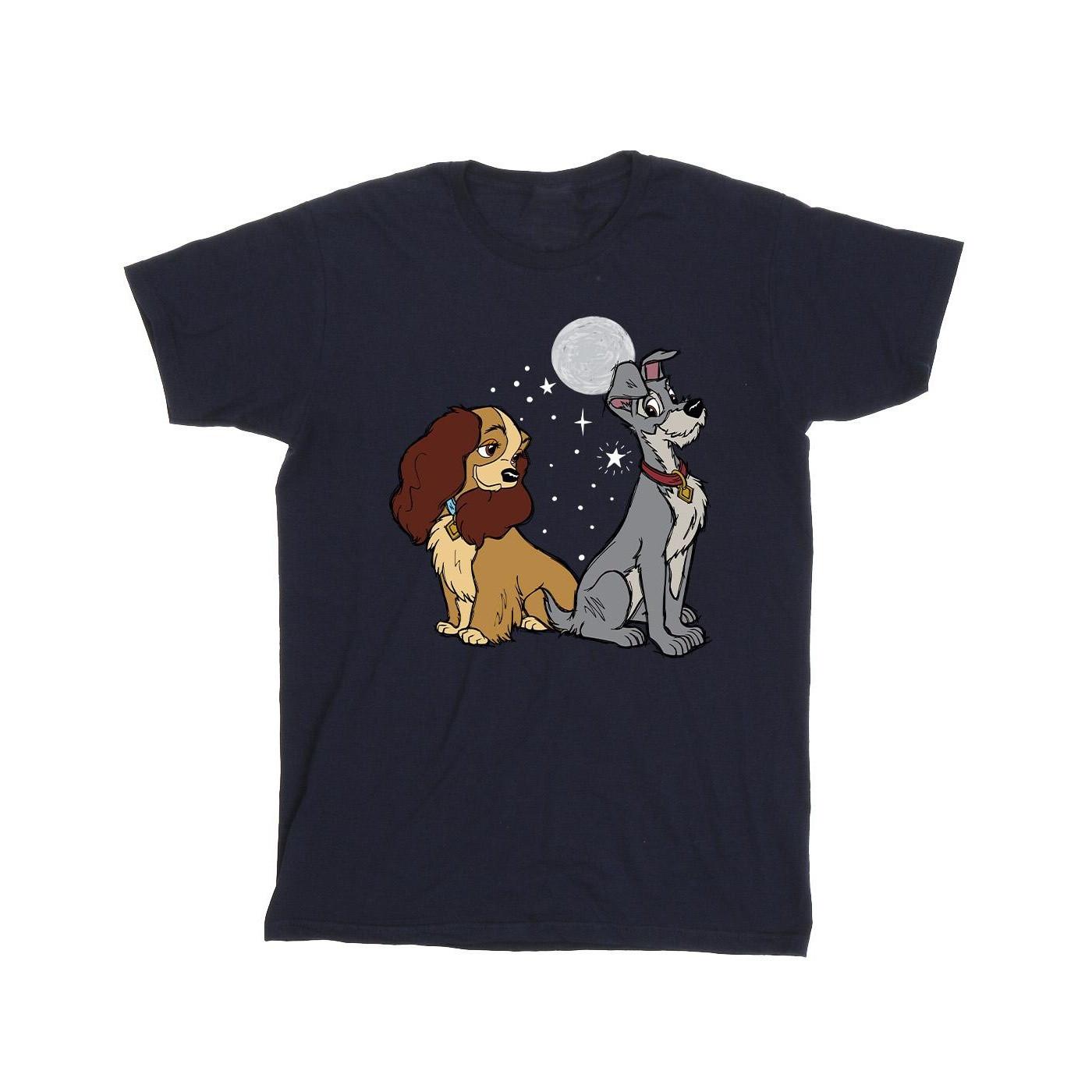 Questa T-shirt presenta una deliziosa grafica di Lilli e il Vagabondo, che cattura un momento classico del celebre film d'animazione. Il design mostra i due iconici cani seduti insieme sotto una luna piena e le stelle, evocando un senso di romanticismo e nostalgia.
