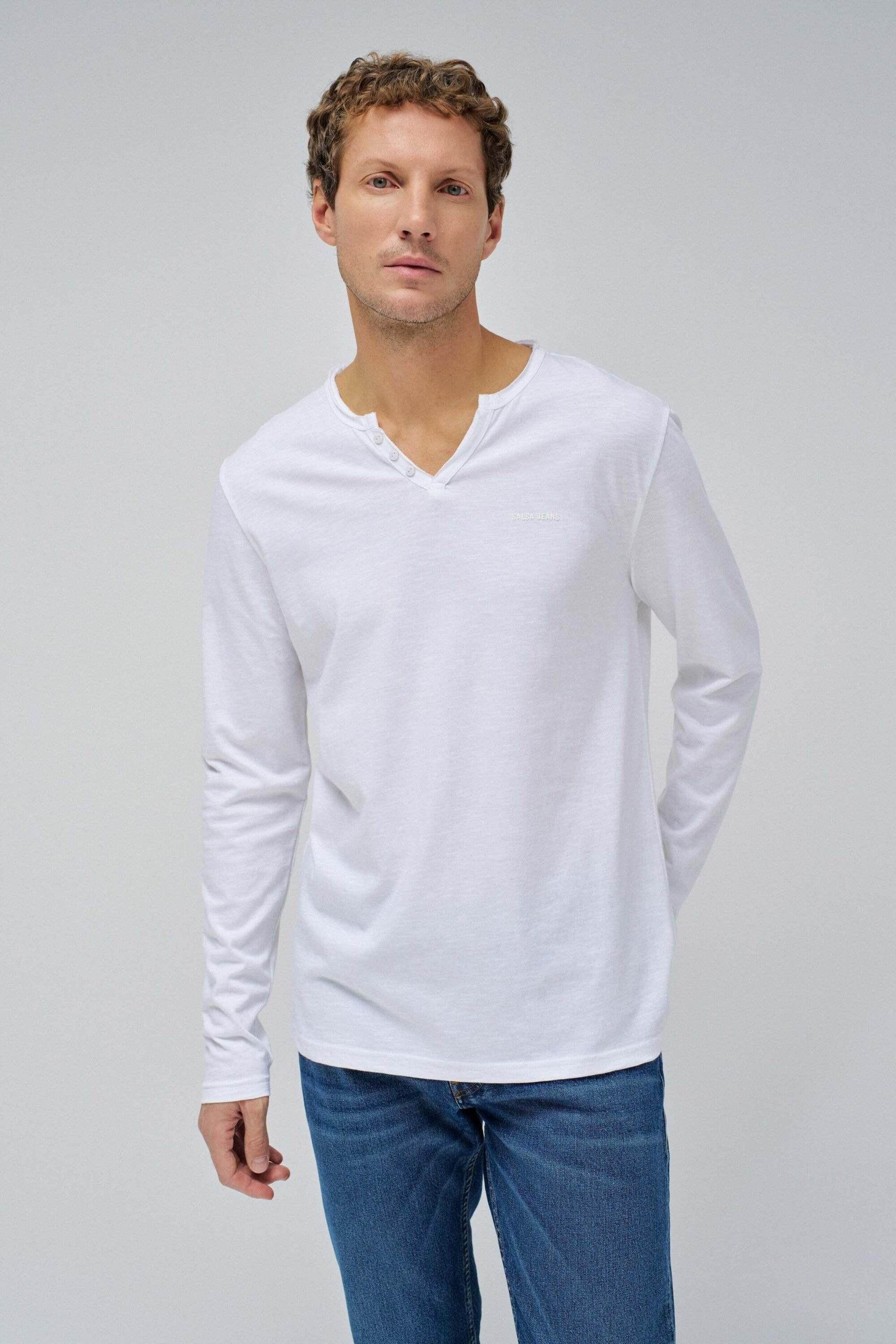Questa maglietta a maniche lunghe in jersey nel classico bianco offre una vestibilità regolare confortevole e uno scollo a V con bottoni. Un discreto marchio tono su tono sul petto completa il design semplice.