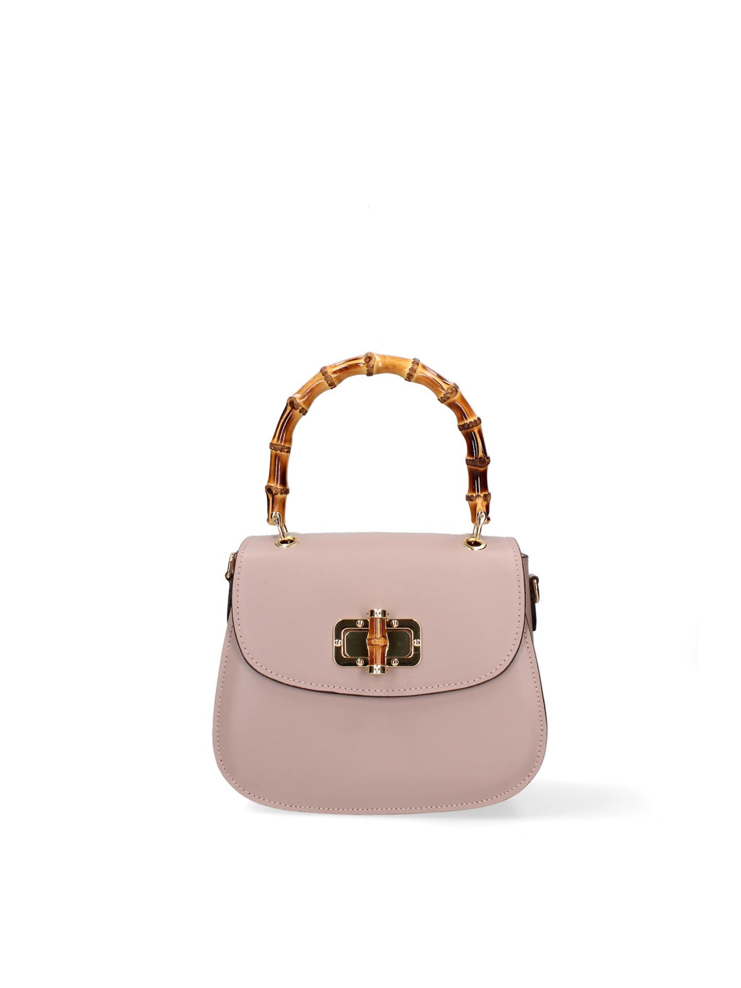 Questa elegante borsa a mano, realizzata in Italia, presenta un distintivo manico in bambù, che aggiunge un tocco di sofisticazione naturale al suo design. La borsa è assicurata da un'elegante chiusura color oro, che completa la sua silhouette classica. Realizzata in vera pelle, offre un accessorio senza tempo per varie occasioni.