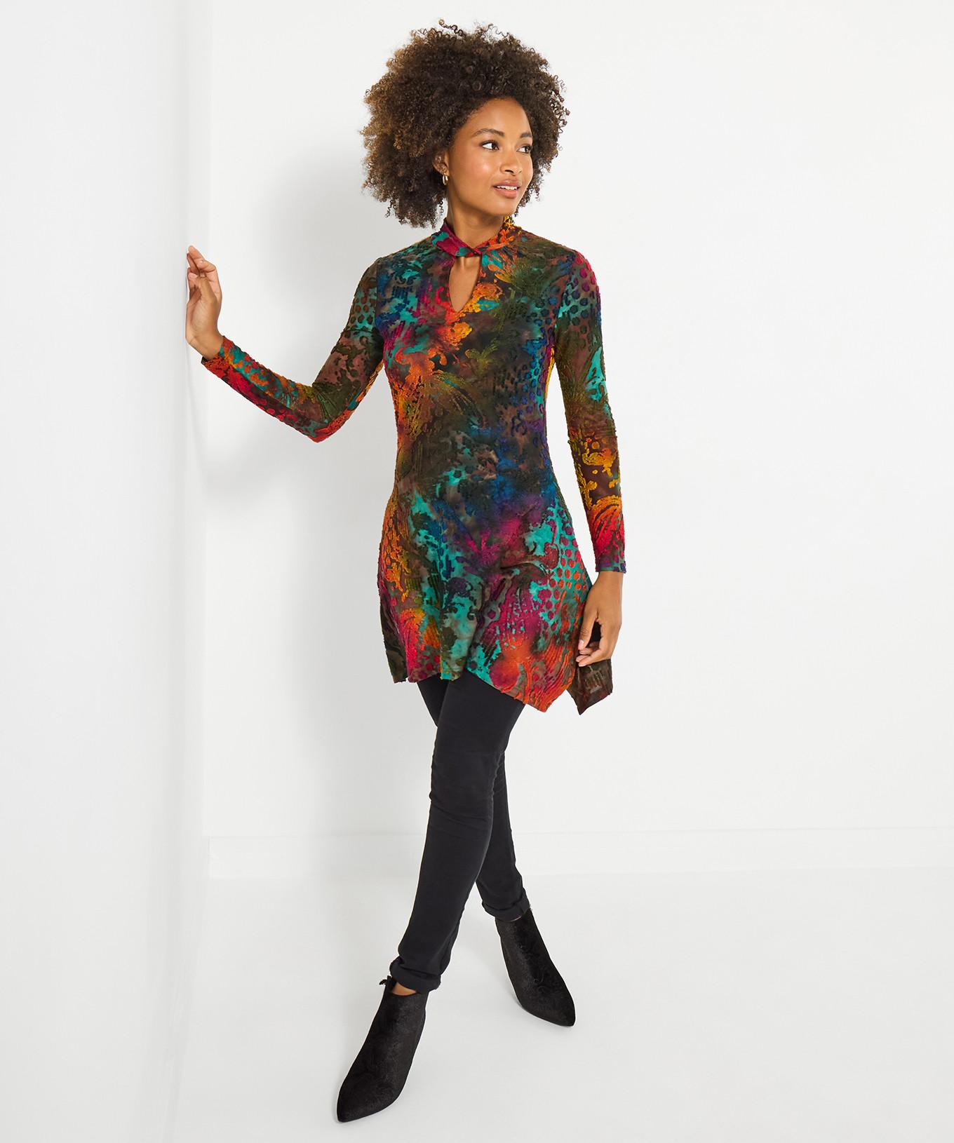 Questa tunica presenta una stampa all-over accattivante che aggiunge un tocco vibrante a qualsiasi outfit. Il design include un collo a listino con scollo a V, offrendo un look moderno ed elegante. Le maniche lunghe e la silhouette fluida la rendono un capo versatile per varie occasioni.