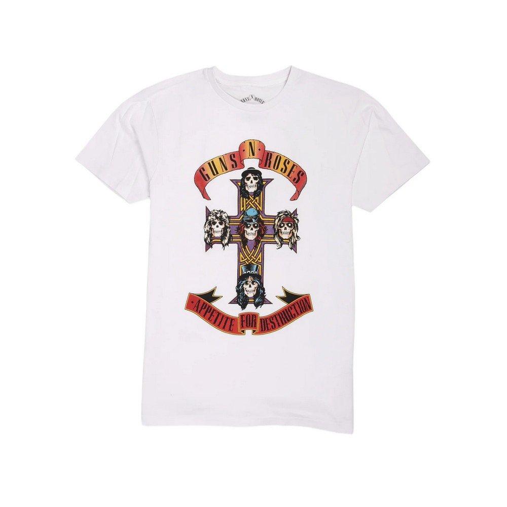 Questa T-shirt presenta un classico girocollo e maniche corte, offrendo una vestibilità comoda e versatile. La parte anteriore è adornata con una stampa grafica audace ispirata all'iconica copertina dell'album "Appetite For Destruction", che mostra il distintivo design a croce e teschio dei Guns N' Roses.
