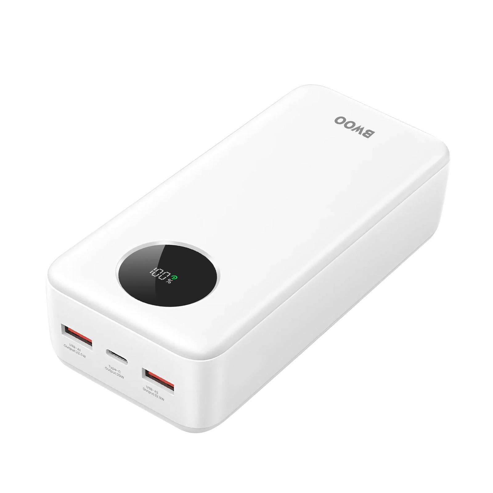 Power bank 30000 mAh firmato Bwoo. 3 porte USB. Ricarica rapida Power Delivery 20W USB. Quick Charge 3.0 22,5W USB-C. Display LCD. Compatta. Sicura. Compatibile con smartphone e tablet. Protezione contro il surriscaldamento e sovraccarico. Ideale per i viaggi.