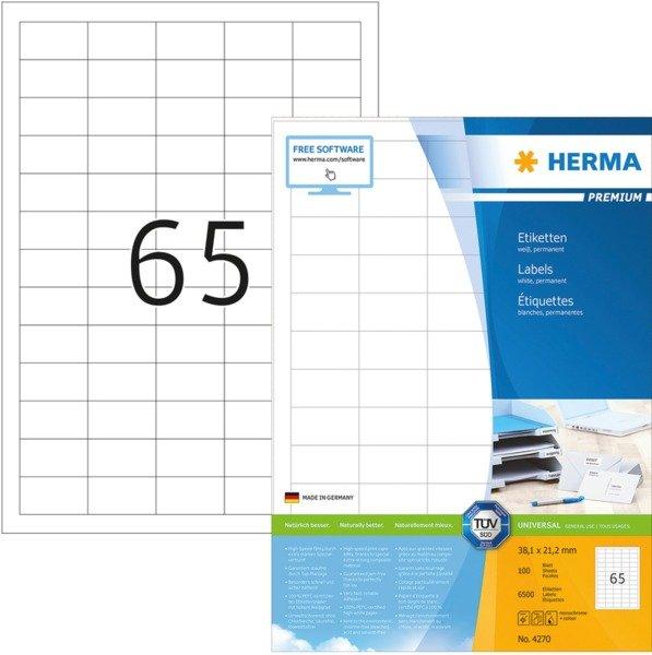Stampate le vostre etichette personalizzate con queste etichette permanenti PREMIUM sviluppate dalla HERMA. Queste etichette autoadesive che misurano 38,1x21,2 mm su fogli A4 sono disponibili in set di 100 fogli per confezione, 6500 etichette per confezione. Sono spesse, robuste, facili da incollare e garantiscono un'adesione permanente. Potete utilizzare queste etichette permanenti per il vostro ufficio, progetti casalinghi e scopi commerciali.