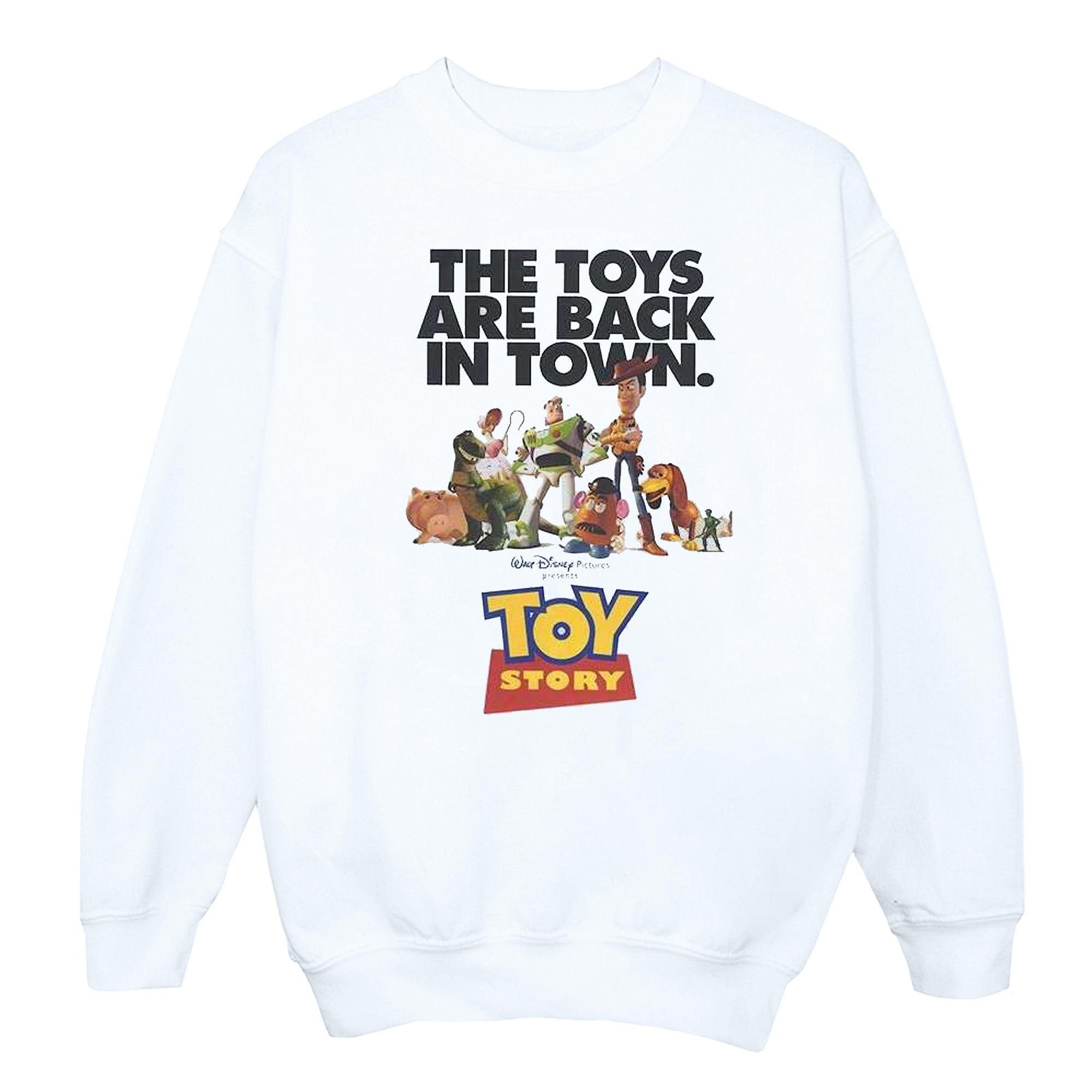 Questa felpa Toy Story presenta un classico girocollo e maniche lunghe, offrendo una vestibilità comoda e rilassata. La parte anteriore della felpa mostra una vivace stampa grafica dei personaggi amati dell'iconico film Disney Pixar, insieme alla frase "THE TOYS ARE BACK IN TOWN".