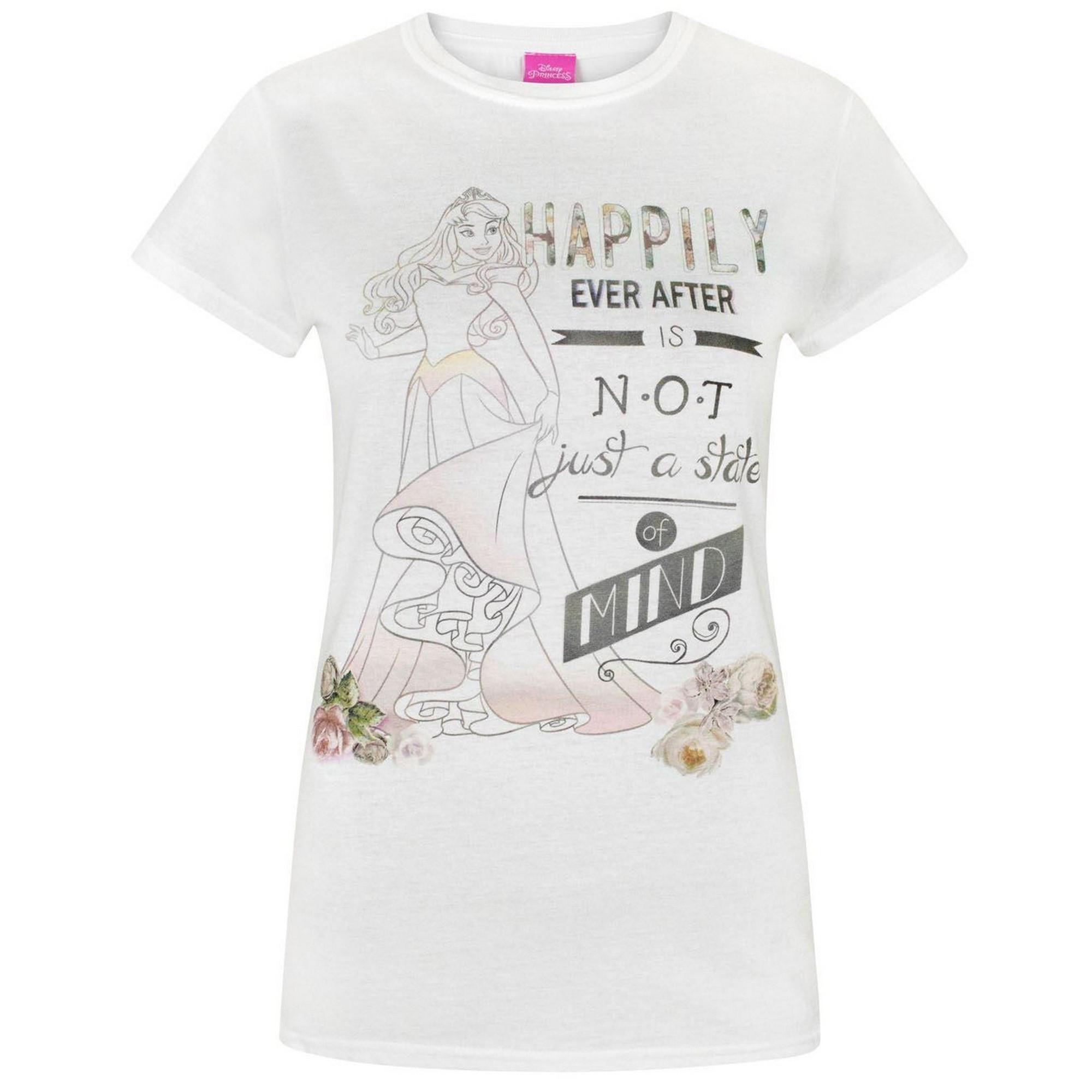 Questa T-shirt presenta una deliziosa grafica della Bella Addormentata, perfetta per gli appassionati delle fiabe classiche. Il design include la frase "Happily Ever After is NOT just a state of MIND" insieme ad accenti floreali, aggiungendo un tocco di fantasia e ispirazione.
