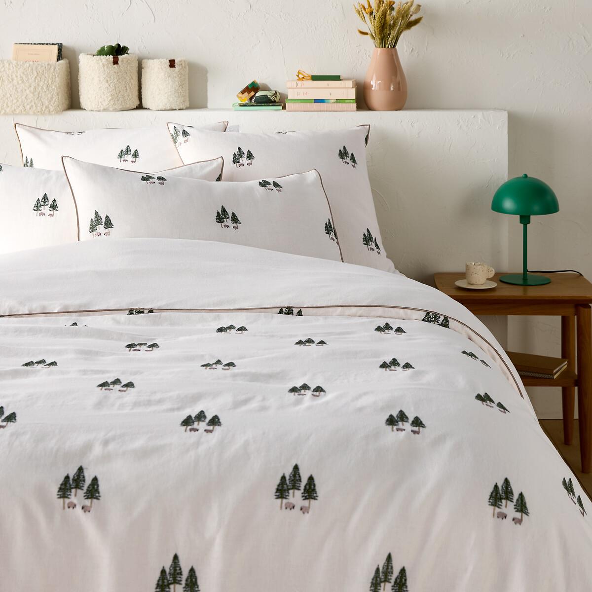 Il copripiumino Anton è realizzato in un bellissimo mezzo lino (misto cotone e lino lavato). I motivi ricamati di abeti e pecore richiamano i tradizionali disegni alpini. Il bordo a piping su tutto il perimetro esalta l'eleganza dei motivi ispirati alla natura.