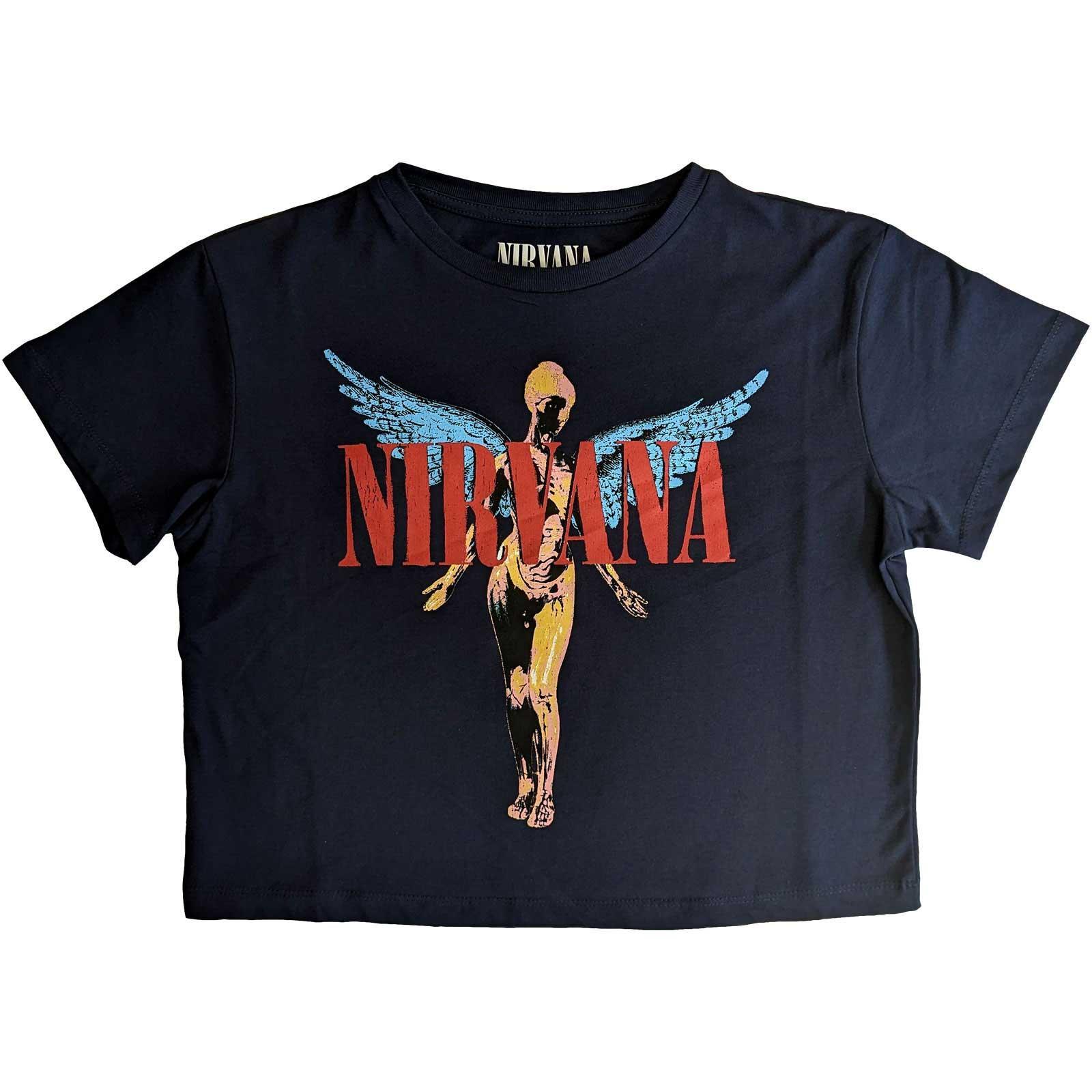 Questo top corto presenta una sorprendente stampa grafica sul davanti, che mostra una figura angelica con ali e il logo "NIRVANA". Il design a maniche corte offre una vestibilità casual e confortevole, rendendolo un'aggiunta versatile a qualsiasi guardaroba.
