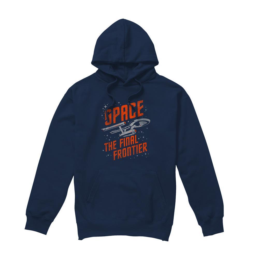 Questa felpa con cappuccio presenta una stampa grafica accattivante con la scritta "SPACE THE FINAL FRONTIER" e la raffigurazione di un'astronave, rendendola un capo distintivo per gli appassionati di esplorazione spaziale e fantascienza. Il design è ben visibile sulla parte anteriore della felpa.