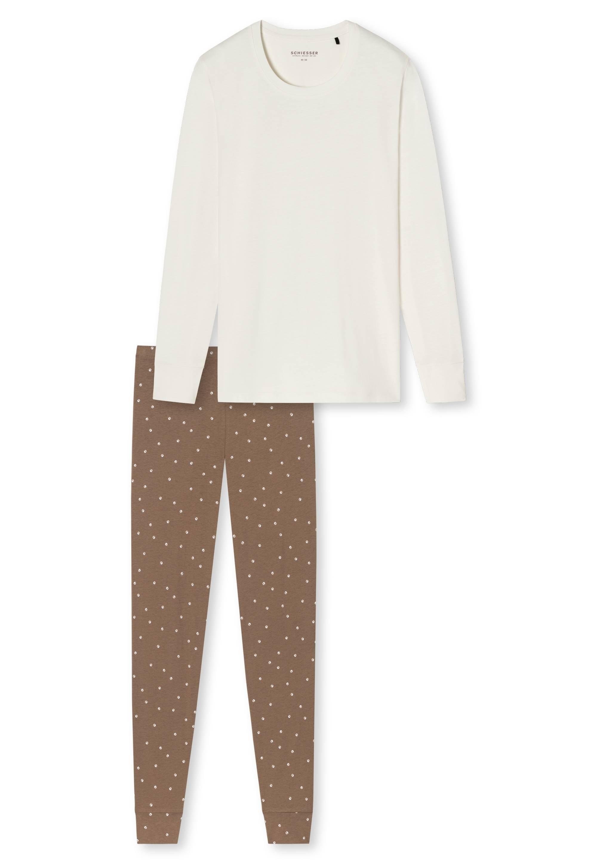 Questo comodo set pigiama offre una vestibilità rilassata per un comfort ottimale. La parte superiore presenta maniche lunghe e uno scollo rotondo, mentre i pantaloni sono adornati con un motivo sottile, rendendo questo set ideale per notti riposanti o per rilassarsi a casa.