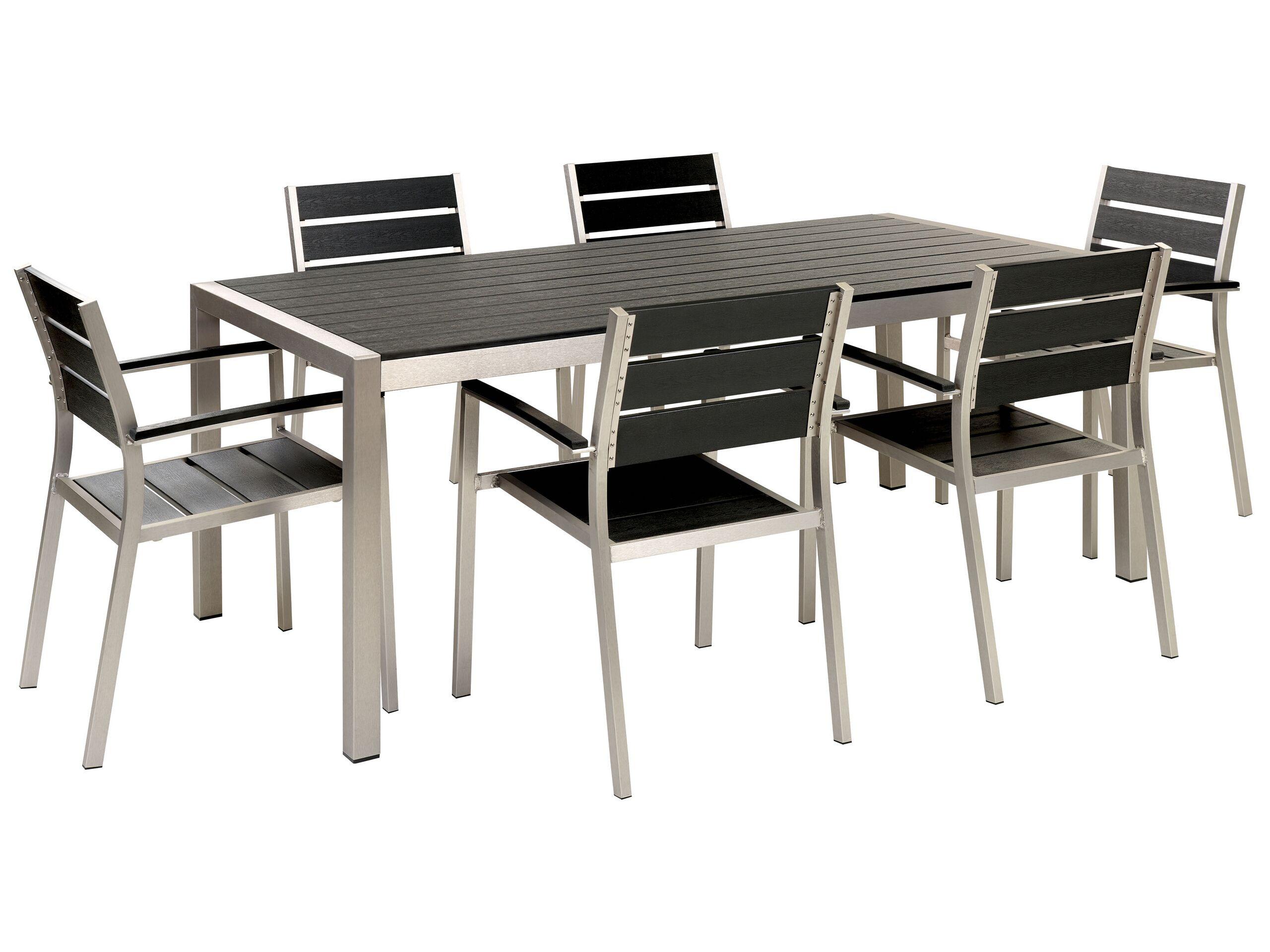 Set di tavolo e sedie in alluminio. Questo comodo ed elegante set da pranzo da esterni è il complemento ideale per il giardino o la terrazza. Composto da un tavolo e 6 sedie, in alluminio anodizzato e legno sintetico, resiste alle intemperie ed è facile da pulire. Impilabili e facili da riporre, le sedie, sono anche dotate di comodi braccioli, per un comfort e uno stile senza pari. Il suo design minimalista infine, rende questo versatile set, adatto davvero a ogni spazio esterno.