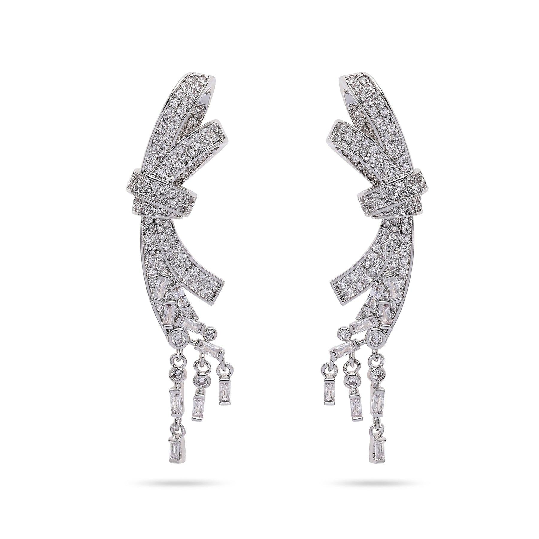 Questi orecchini a cerchio presentano un design scultoreo e scenografico. Una forma a fiocco tempestata di cristalli si curva lungo l'orecchio, creando una cascata di fili di cristallo pendenti. I dettagli intricati e la silhouette audace creano un accessorio glamour e accattivante. Dimensioni: 1,3 cm x 5,3 cm | Placcatura: rodio | Chiusura: perno e retro