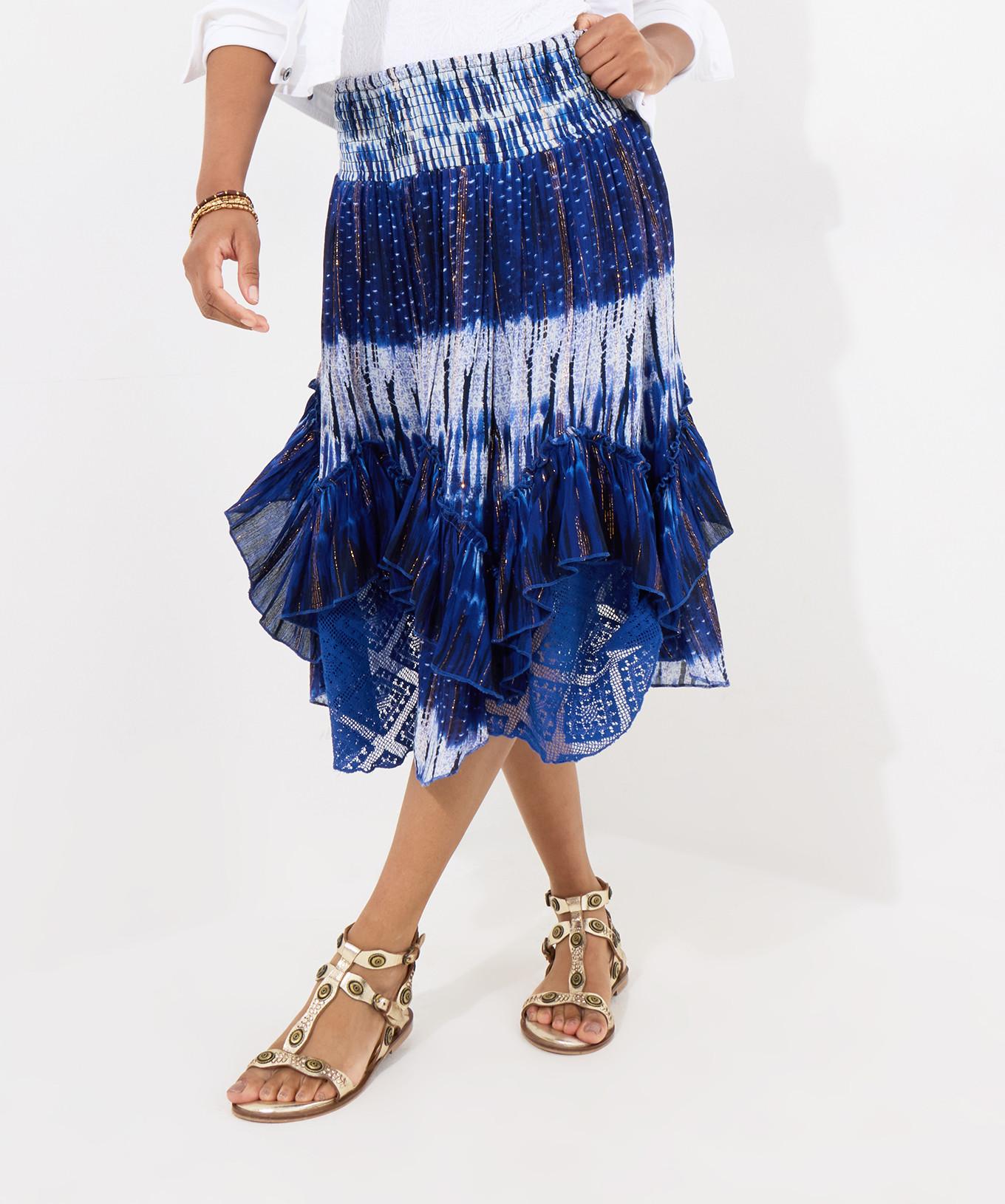 Questa giocosa gonna effetto tie-dye è ricca di dettagli di stile preferiti. Il design incorpora una comoda fascia elastica in vita e un orlo a balze a strati, creando una silhouette giocosa e dinamica.
