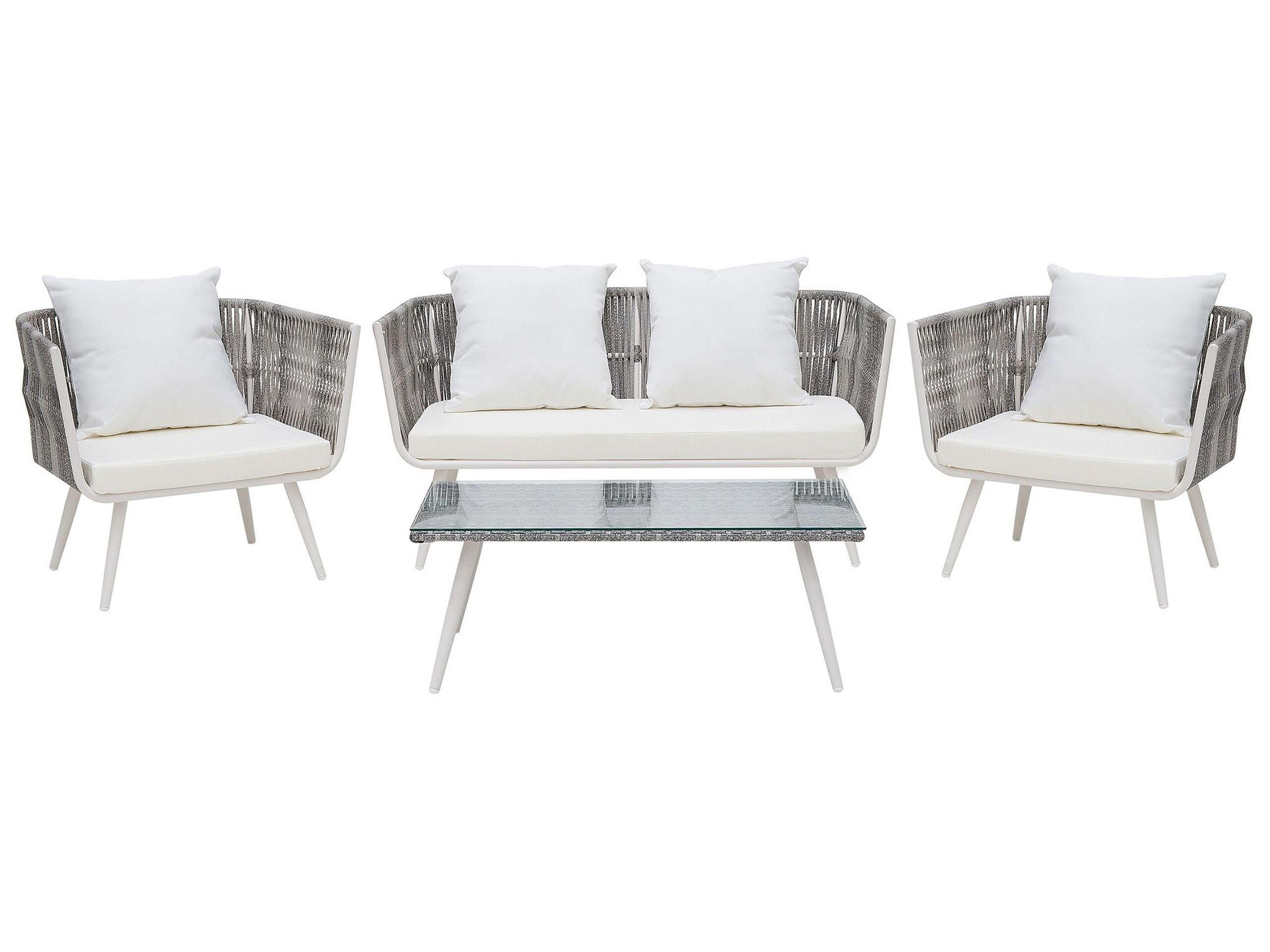 Moderno set da giardino a 4 posti. Questo set da giardino semplice ma elegante crea un'elegante area conversazione in qualsiasi ambiente esterno. Grazie al suo design minimalista con un tocco moderno, il set si fonde perfettamente con una varietà di stili di arredamento e combinazioni di colori. Il divanetto, le poltrone e il tavolo sono caratterizzati da una struttura in acciaio che, accoppiata al rattan sintetico, rende il mobile solido e resistente. Il tavolino da caffè è dotato di un piano in vetro temperato, che lo rende il luogo perfetto per le tue bevande, snack e riviste preferite.