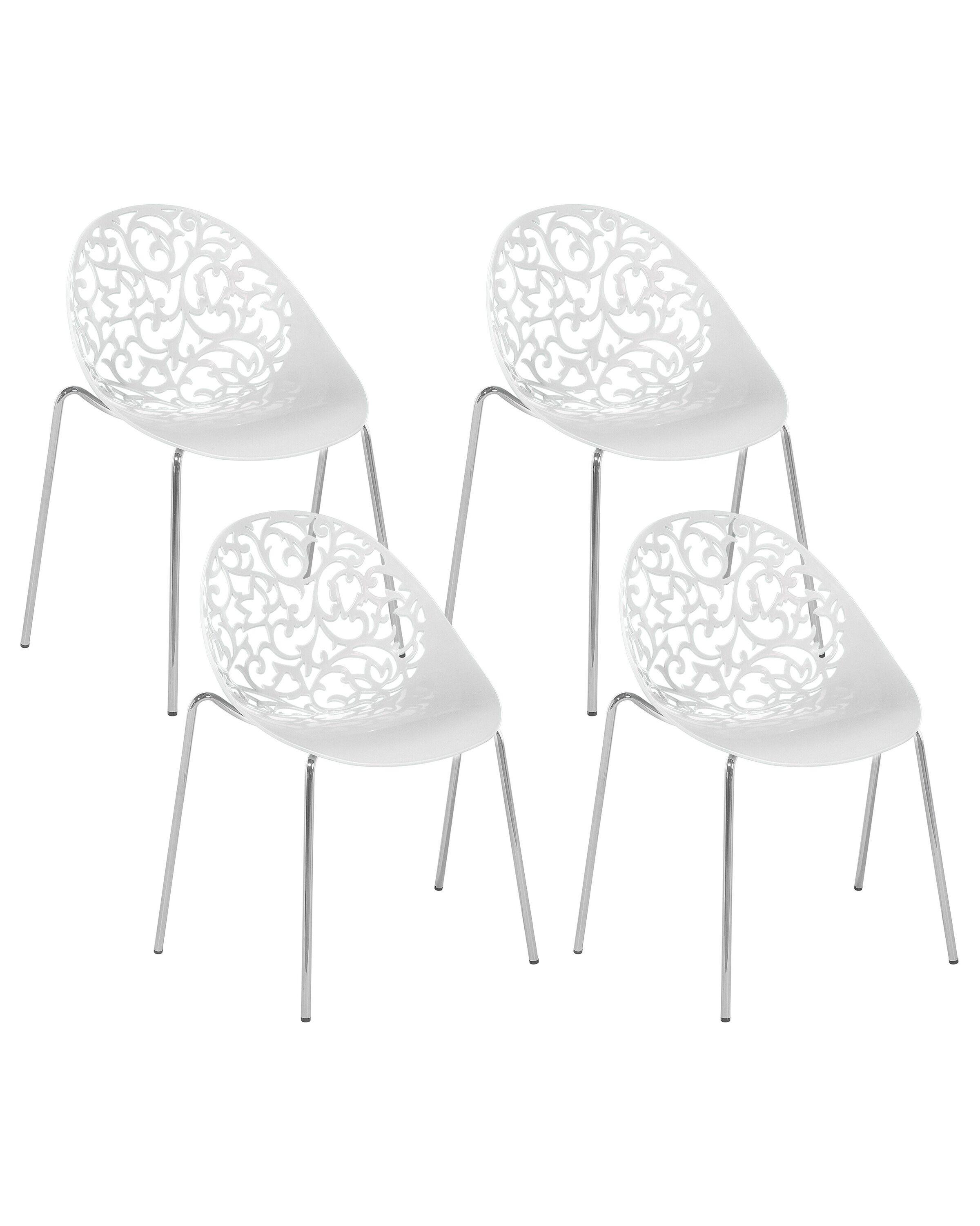Set moderno di 4 sedie per interni ed esterni. Bellissimo set di 4 sedie da pranzo per interni ed esterni. È realizzato in materiale sintetico di alta qualità con gambe in metallo resistenti. Lo schienale floreale attira l'attenzione. Si abbina bene a qualsiasi stile di sala da pranzo, cucina o giardino.