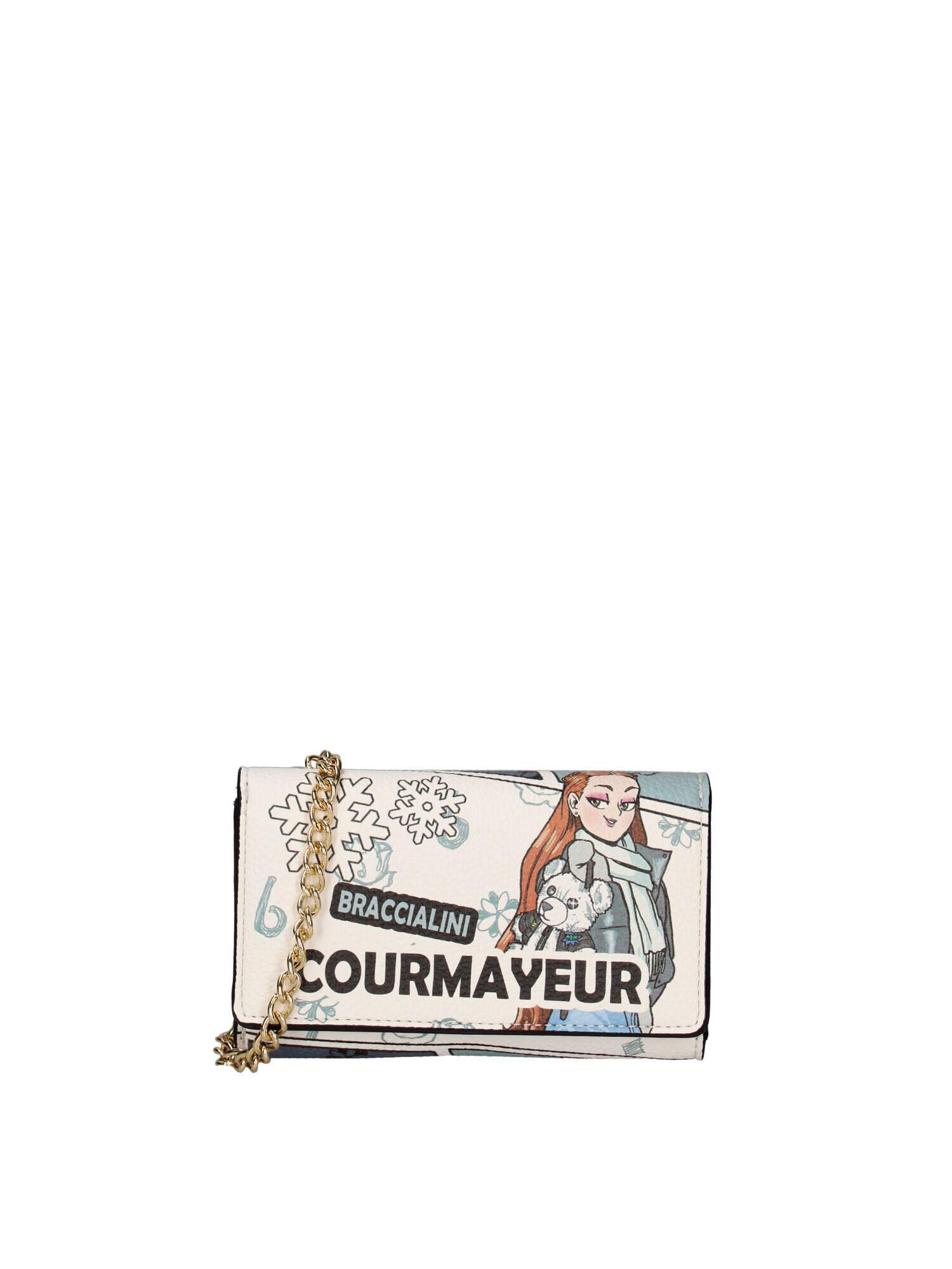 Questo portafoglio Braccialini Courmayeur presenta una stampa grafica giocosa, rendendolo un accessorio distintivo. Il design include un'illustrazione di un personaggio e il testo 'Courmayeur', completato da un motivo sottile sul retro. È dotato di una catena color oro, che aggiunge un tocco di eleganza e funzionalità. Il portafoglio ha una chiusura a zip e tasche interne per carte e banconote.
