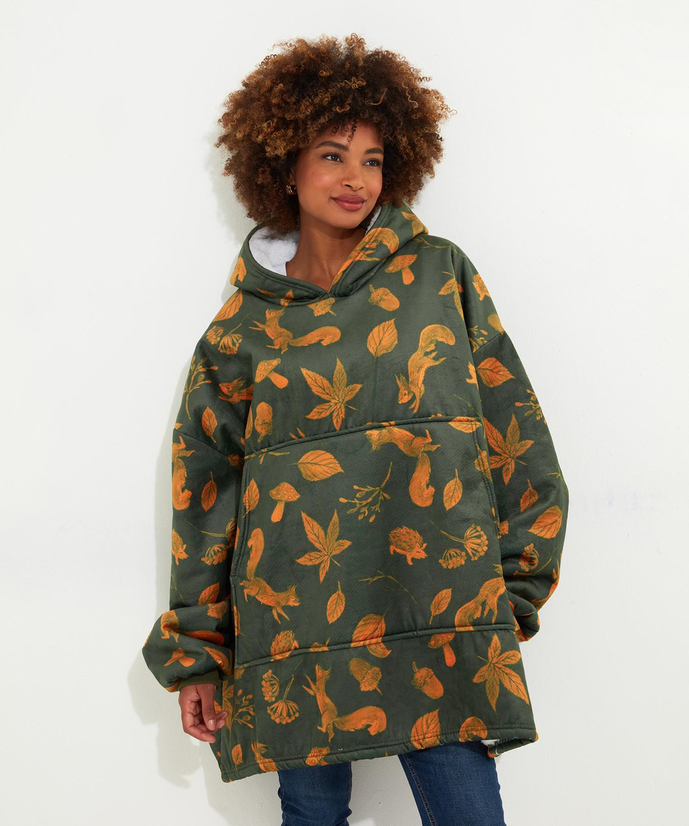 Questa felpa in pile con cappuccio presenta un affascinante motivo boschivo, rendendola una scelta accogliente ed elegante per le giornate di relax. Il design include vari elementi ispirati alla natura, come foglie, scoiattoli e funghi, creando un look giocoso ma raffinato.