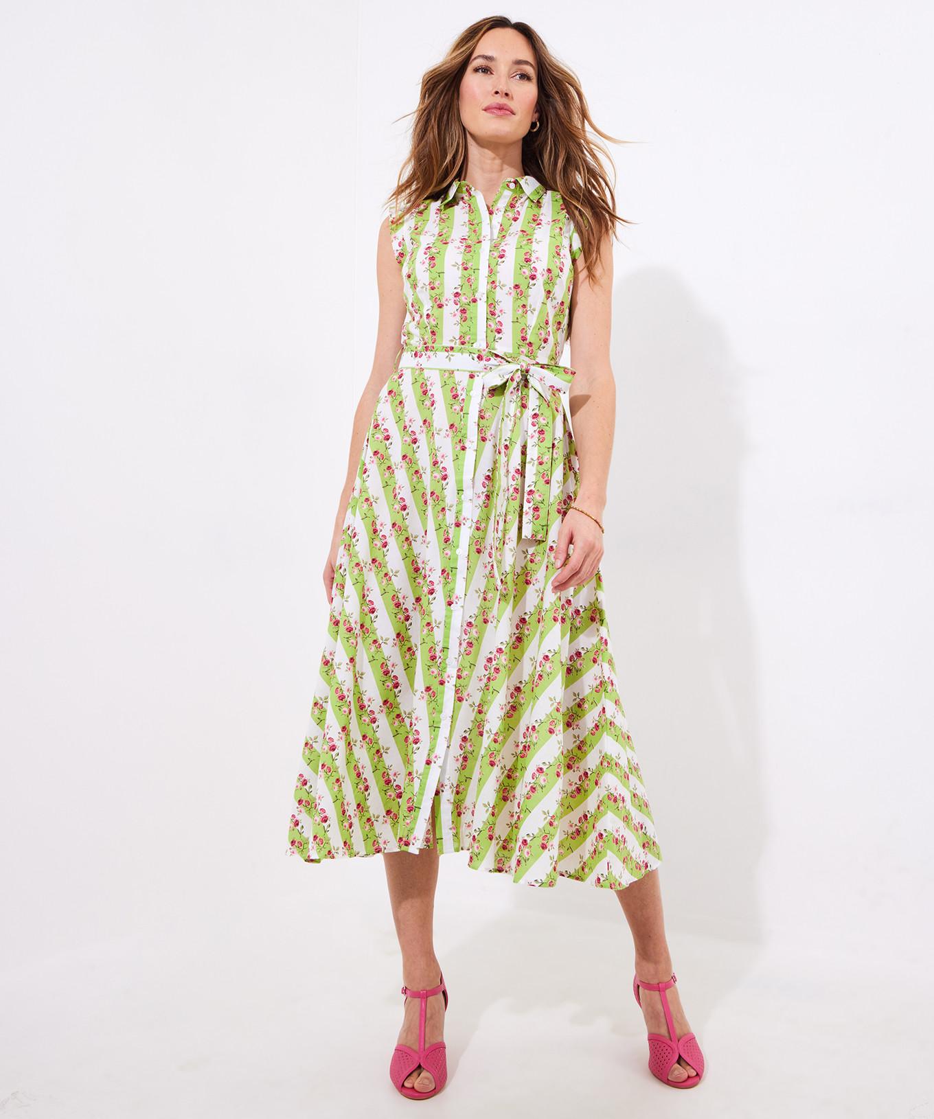 Questo abito in vita presenta un vivace motivo a righe adornato con delicati motivi floreali, creando un look fresco ed elegante. Il design include un colletto classico e una cintura da annodare in vita, che consente una silhouette lusinghiera. Questo abito è un'aggiunta versatile a qualsiasi guardaroba, adatto a varie occasioni.