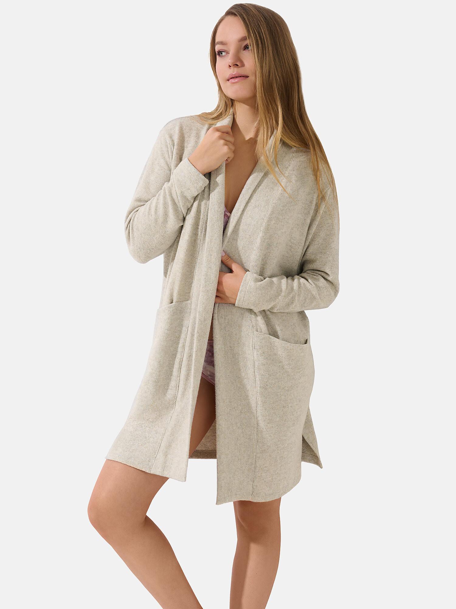 Questa rilassante giacca da casa della collezione Olivette offre una vestibilità comoda e rilassata, perfetta per il relax. La giacca allungata presenta cuciture delle spalle leggermente ribassate e un ampio orlo anteriore che può essere indossato come sciarpa nella scollatura. Le tasche, sempre pratiche, sono eleganti e senza cuciture sul davanti. La giacca può essere utilizzata come cardigan per uscire o come vestaglia sopra il pigiama nelle mattine fredde. Ha una lunghezza di circa 85 cm.