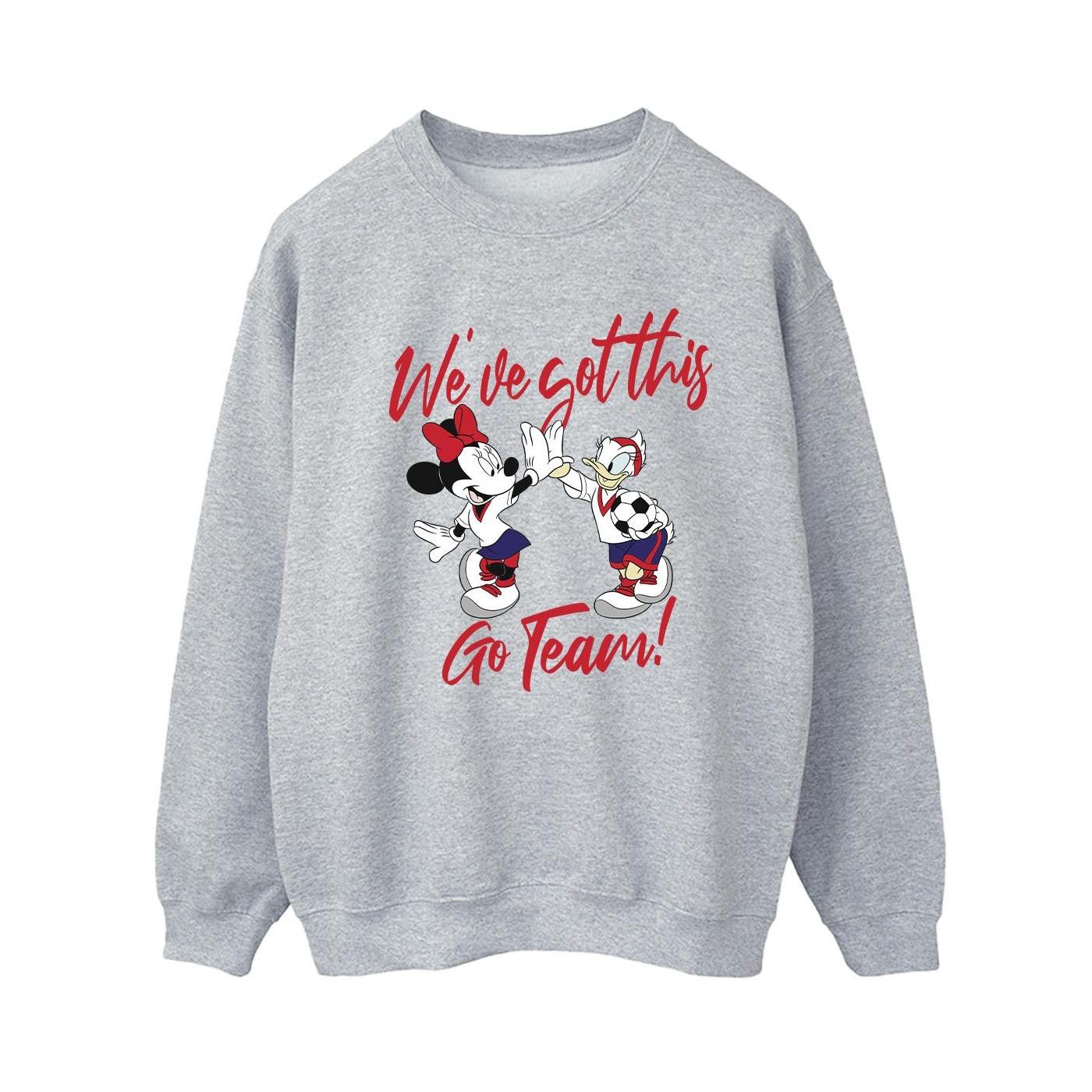 Questa felpa presenta una grafica giocosa di Minnie Mouse e Paperino che si danno il cinque, con il testo incoraggiante "We've got this Go Team!". È progettata per il comfort e una vestibilità rilassata, rendendola un'aggiunta versatile a qualsiasi guardaroba casual.