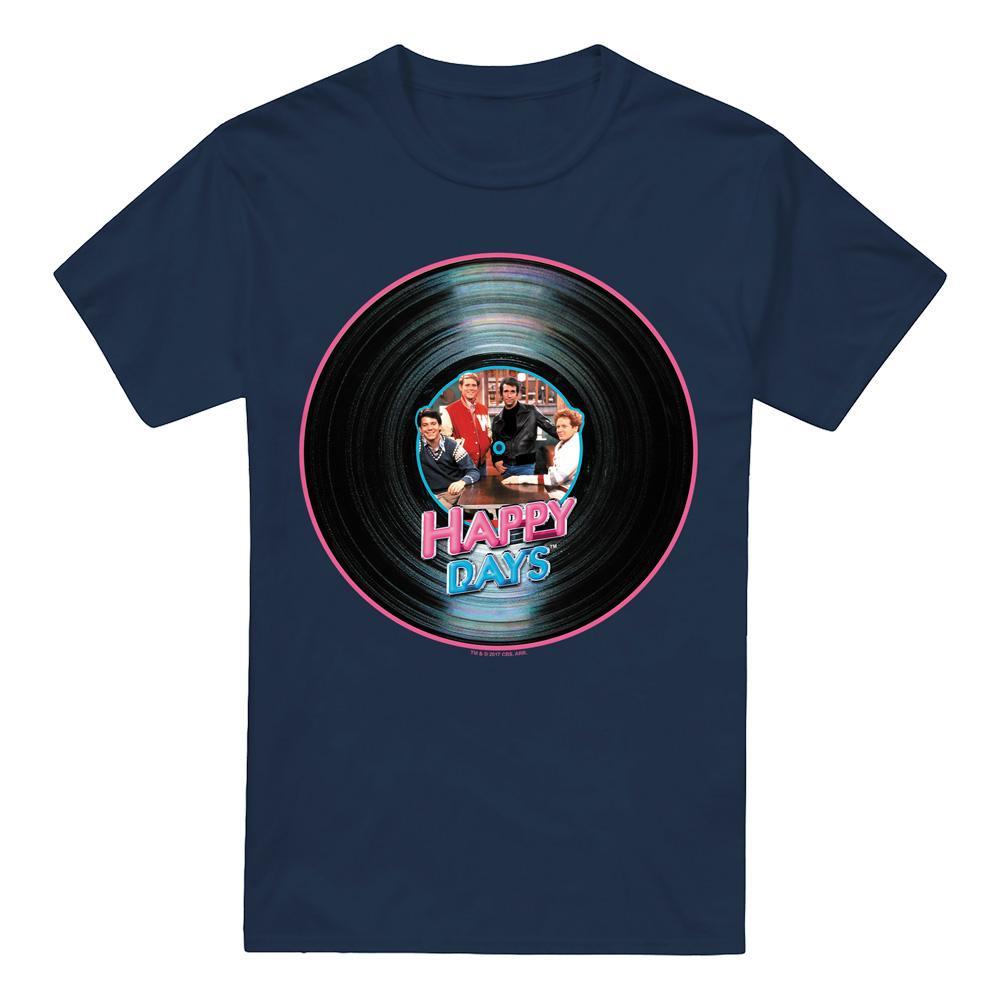 Questa T-shirt presenta un classico girocollo e maniche corte, offrendo una vestibilità comoda e versatile per l'uso quotidiano. La parte anteriore è adornata con una stampa grafica di un disco in vinile, con personaggi di "Happy Days" e il logo dello show, aggiungendo un tocco di fascino retrò.