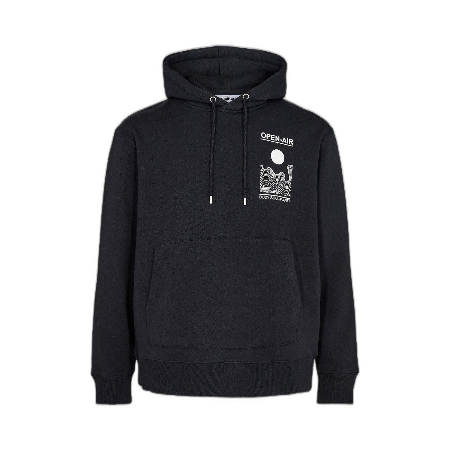 La felpa con cappuccio Minimum 9297 è una felpa con cappuccio comoda ed elegante. Presenta una stampa grafica sul petto con il testo "OPEN-AIR" e "BODY-SOUL-PLANET", che aggiunge un tocco distintivo al design. La felpa include una pratica tasca a canguro e un cappuccio regolabile con coulisse per maggiore comfort e versatilità.