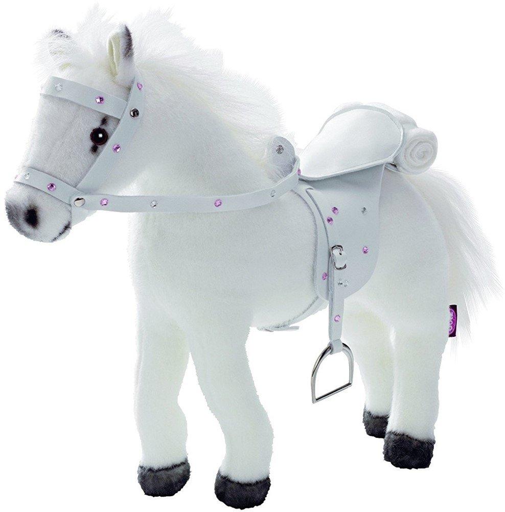 Biegsames Plüschpferd mit Soundchip für Stehpuppen. Masse: 33 × 10 × 40 cm. Ideal für Stehpuppen bis 50 cm. Biegsam und posierbar.