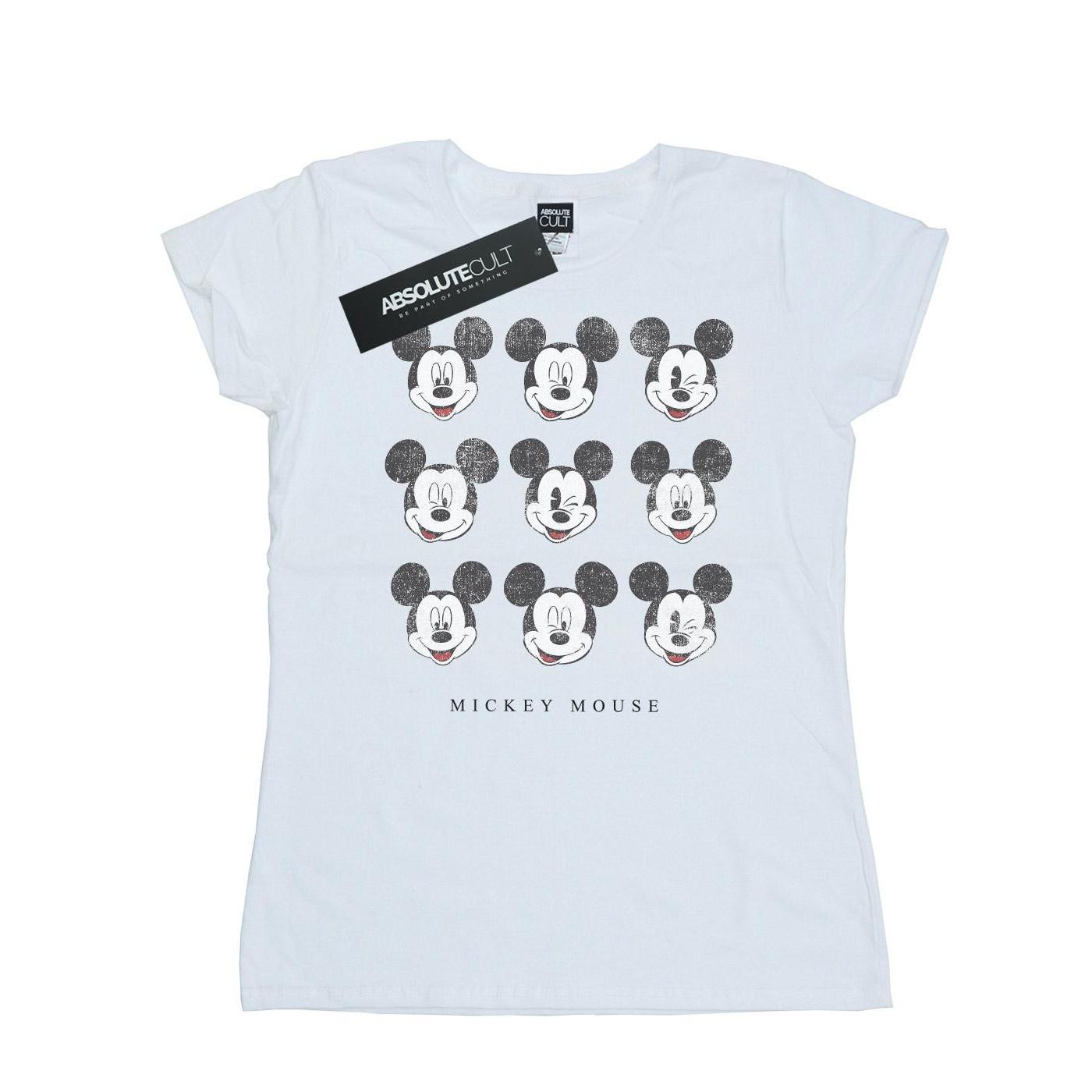 Questa T-shirt presenta un classico girocollo e maniche corte, offrendo una vestibilità comoda e versatile. La parte anteriore è adornata con una stampa grafica di più volti di Topolino, che mostrano varie espressioni, insieme al testo "Mickey Mouse" sotto il design.