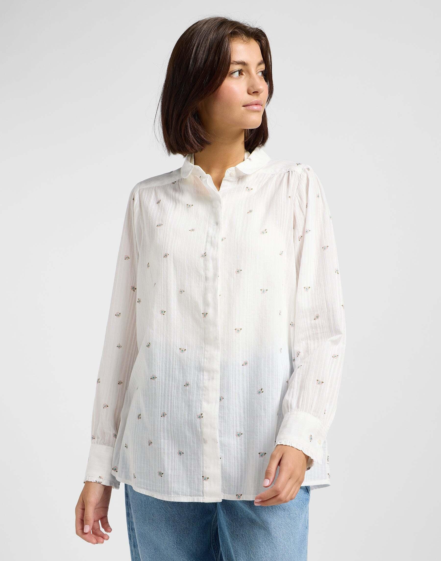 Il piccolo colletto curvo e i polsini con volant accentuano lo stile femminile, rendendo la camicia un capo accattivante che si abbina splendidamente ai jeans. È realizzata in cotone Dobby biologico non elasticizzato, particolarmente leggero e traspirante, ideale per i caldi mesi estivi. Le strisce Dobby bianco crema e i graziosi e delicati fiorellini conferiscono alla blusa un look giocoso ma elegante. La chiusura a bottoni e i polsini abbottonati completano il design e aggiungono sottili accenti.