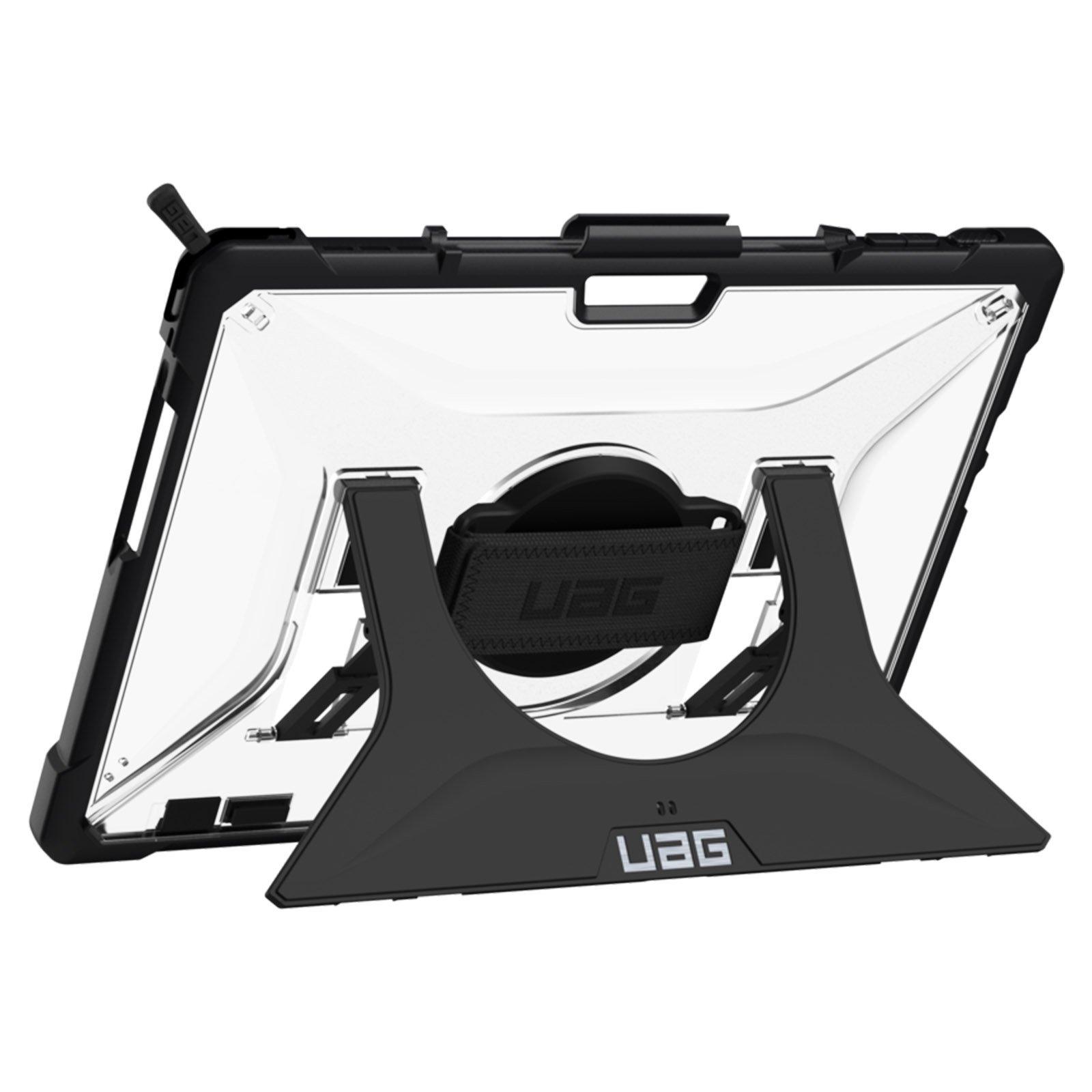 Cover per Microsoft Surface Pro 9, by UAG Plasma Series. Rispetta gli standard militari MIL-STD-810G. Con retro trasparente e dettagli in rilievo. Munita di manico di sostegno, cavalletto di supporto e tracolla da trasporto. Slot da pennino integrato.