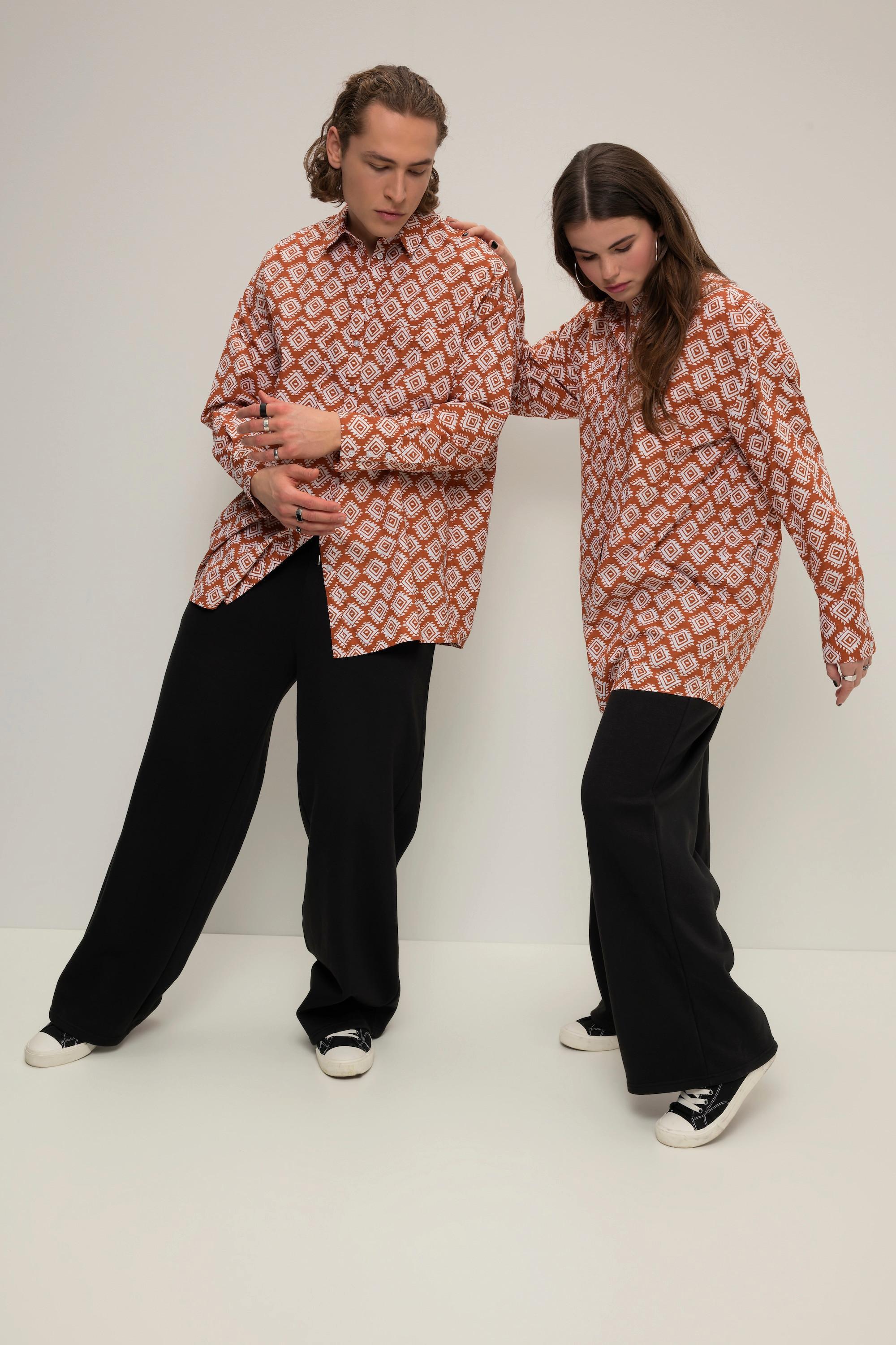 Questa camicia oversize presenta una stampa all-over accattivante, un classico colletto da camicia e maniche lunghe. Progettata per una vestibilità unisex, offre uno stile rilassato e versatile.