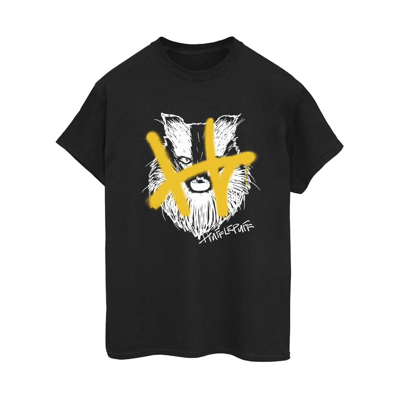 Questa T-shirt Hufflepuff presenta una stampa grafica distintiva, rendendola un'aggiunta unica a qualsiasi collezione di fan. Il design mostra l'iconico emblema del tasso con una 'H' stilizzata in sovrapposizione, riflettendo lo spirito di dedizione e duro lavoro della casa. La T-shirt è realizzata in 100% cotone ring-spun, offrendo una sensazione super morbida e una comoda vestibilità boyfriend.