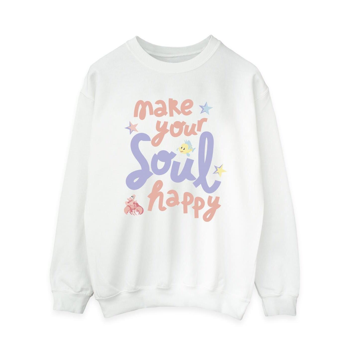 Questa felpa presenta una grafica affascinante ispirata a "La Sirenetta" di Disney, perfetta per aggiungere un tocco di fantasia a qualsiasi outfit casual. Il design include la frase "make your Soul happy" accanto agli amati personaggi Flounder e Sebastian, circondati da stelle giocose.