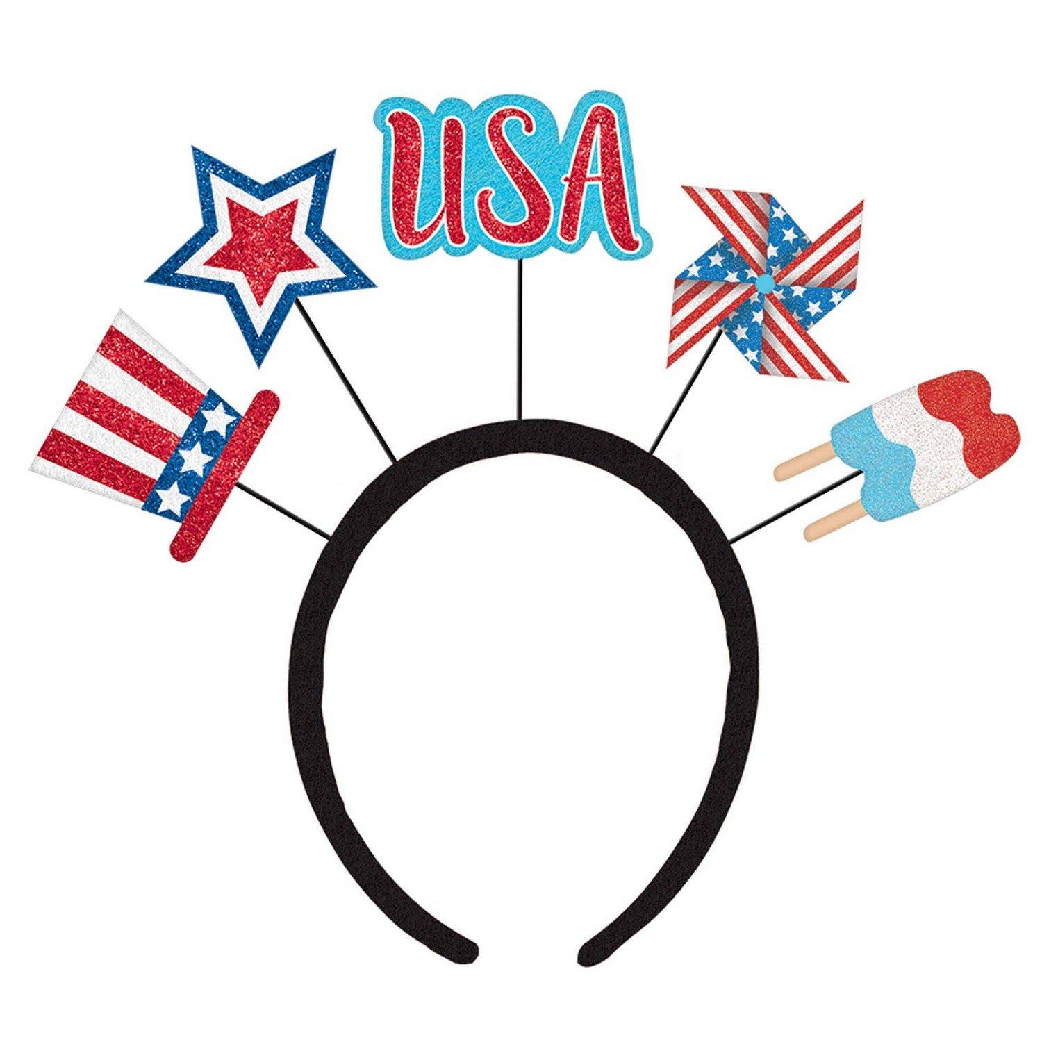 Questa fascia festiva è pensata per celebrare occasioni patriottiche. Presenta una fascia nera adornata con vari bopper a tema, tra cui una stella, la parola "USA", una girandola e un ghiacciolo, tutti nei colori rosso, bianco e blu.