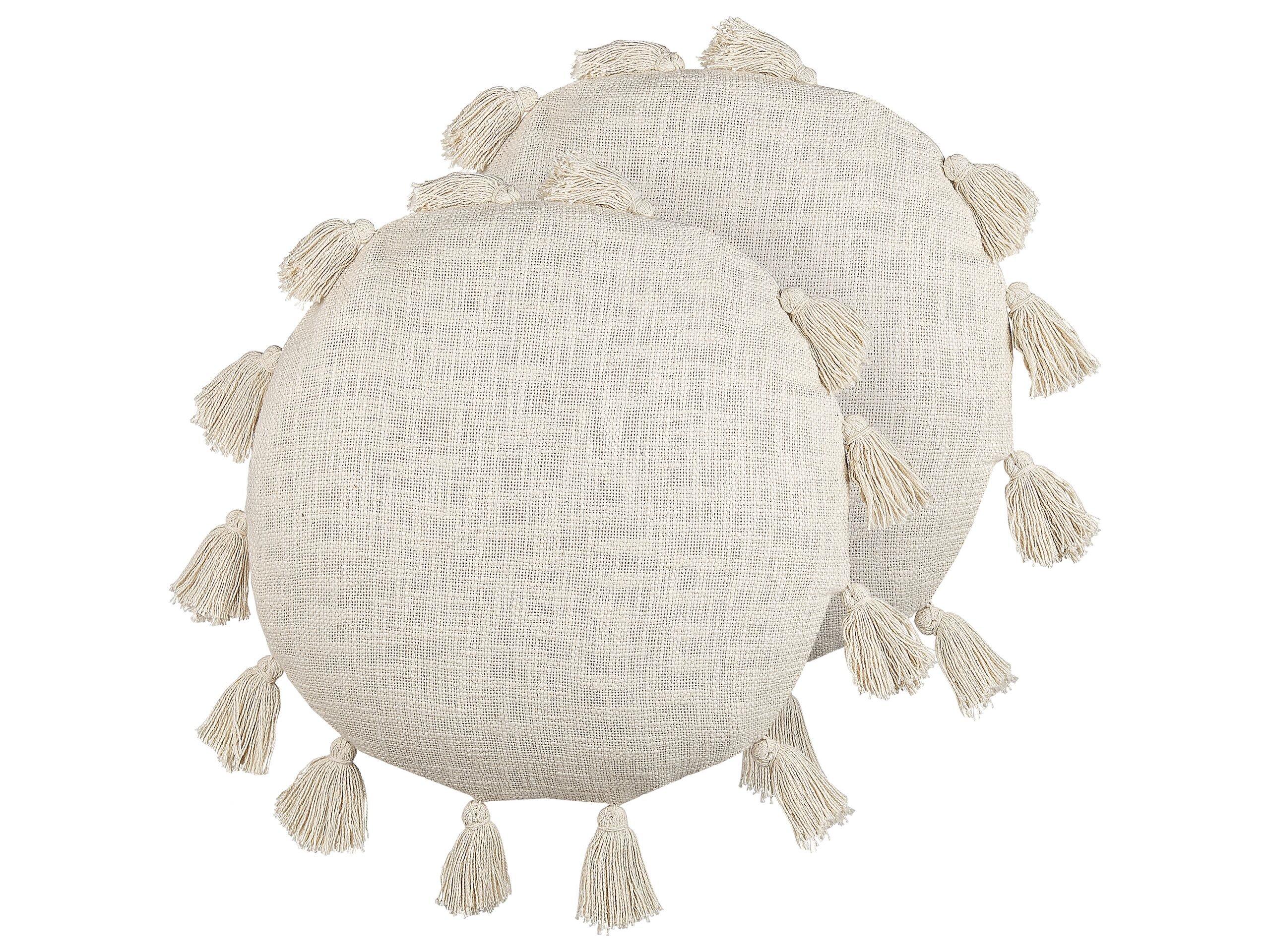 Coppia di cuscini decorativi rotondi. Basta poco per rinnovare il soggiorno o la camera da letto, questo set di 2 cuscini decorativi fa al caso tuo. È realizzato in soffice ma durevole cotone di altissima qualità. Le nappe decorative si adattano bene a qualsiasi interno in stile boho. La fodera è dotata di una cerniera che ne facilita la pulizia. Ha un bell'aspetto da solo o in combinazione con altri cuscini.