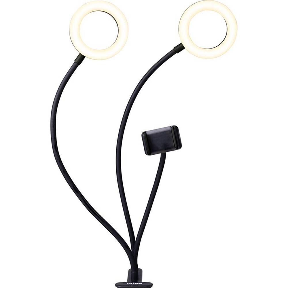 La doppia luce ad anello DORR SLR-12 Bi-Color garantisce un'illuminazione ideale di due pagine per Selfie, foto e video. Grazie ai bracci di supporto flessibili, le due luci ad anello possono essere allineate in un batter d'occhio in modo da ottenere un'illuminazione ottimale del soggetto in qualsiasi momento. In particolare, se si è portatori di occhiali, è possibile ridurre al minimo o evitare completamente un riflesso nei vetri degli occhiali grazie a un posizionamento intelligente delle due sorgenti luminose. Grazie al supporto universale per smartphone, anche il vostro smartphone è posizionato correttamente nel NU.Oltre alla luminosità, è anche possibile modificare la temperatura del colore, adattando così la caratteristica del colore al soggetto e alla luce ambientale. Le vostre foto e video per Instagram, YouTube e Co. Raggiungono una qualità dell'immagine completamente nuova.L'SLR-12 è particolarmente adatto per lo streaming in diretta, la videotelefonia in Homeoffice, per l'insegnamento digitale in ambito Homeschocoling, per le riunioni ZOOM o le chat FaceTime. Ma anche le foto e i video dei prodotti possono essere inseriti perfettamente nella scena con l'SLR-12. Il successo per la vostra web-performance, il vostro negozio online e su eBay è garantito. LED BI-COLOR Ciascuna delle due lampade ad anello a LED ha un diametro di 12 cm ed è dotata di 40 LED ciascuno (20 x bianco freddo e bianco caldo). In totale, 80 LED garantiscono una luce particolarmente morbida che compensa le irregolarità della pelle. Grazie ai LED disposti ad anello, si crea un riflesso luminoso naturale e rotondo nell'occhio. 3 MODALITÀ DI LUCE L'SLR-12 dispone di tre diverse modalità di illuminazione, che possono essere controllate comodamente e facilmente tramite il pannello di controllo integrato: Luce fredda con una temperatura di colore di circa 6800 K. Questa luce neutra e particolarmente luminosa è ideale, ad esempio, per l'illuminazione durante le riprese di prodotto. Luce mista con una temperatura di colore di circa 4500 K. Luce molto naturale e vantaggiosa che garantisce un bel tono della pelle. Perfetto per Selfie, tutorial, video di bellezza e registrazioni, dove il viso deve essere valorizza. Luce calda con una temperatura di colore di circa 3800 K. Luce molto morbida e calda per scene ed effetti suggestivi.Oltre alla temperatura del colore, la luminosità può essere regolata in 10 livelli in qualsiasi modalità di luce selezionata. MORSETTO TISCHIA Non cè niente di più semplice! Con il morsetto da tavolo, la luce ad anello Selfie LED è fissata al bordo del tavolo in un batter d'occhio. Il morsetto da tavolo può essere montato su angoli del tavolo o su altre possibilità di fissaggio adatte fino a una larghezza massima di 5,5 cm. SUPPORTO PER SMARTPHONE E SUPPORTO A BARRA Il robusto supporto per smartphone si adatta agli smartphone con una larghezza da 60 a 90 mm. Lo smartphone viene semplicemente bloccato tra i due morsetti in gomma. Per allineare lo smartphone e le luci ad anello è sufficiente piegare il corrispondente collo di cigno flessibile nella posizione desiderata. ALIMENTAZIONE USB L'alimentazione della luce ad anello a LED avviene tramite collegamento USB (5V, 2A), quindi è sufficiente collegarlo alla presa USB del PC/notebook/laptop. Il cavo USB lungo 140 cm consente un ampio raggio di movimento tra la luce e la fonte di alimentazione USB.