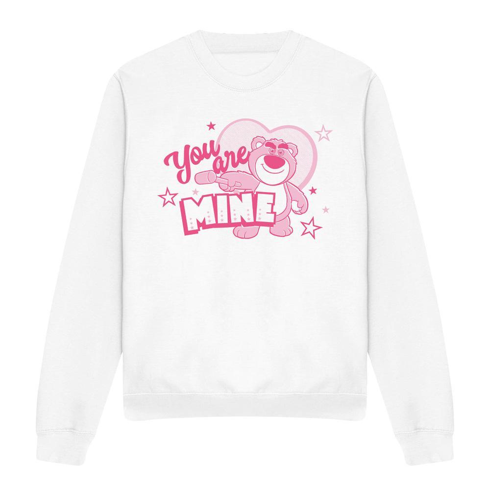 Questa felpa presenta una stampa grafica giocosa sul davanti, rendendola un'aggiunta affascinante a qualsiasi guardaroba casual. Il design include un personaggio con la frase "You are MINE" e accenti a stella, il tutto in tonalità di rosa su sfondo bianco. È un prodotto con licenza ufficiale e progettato per una vestibilità regolare.