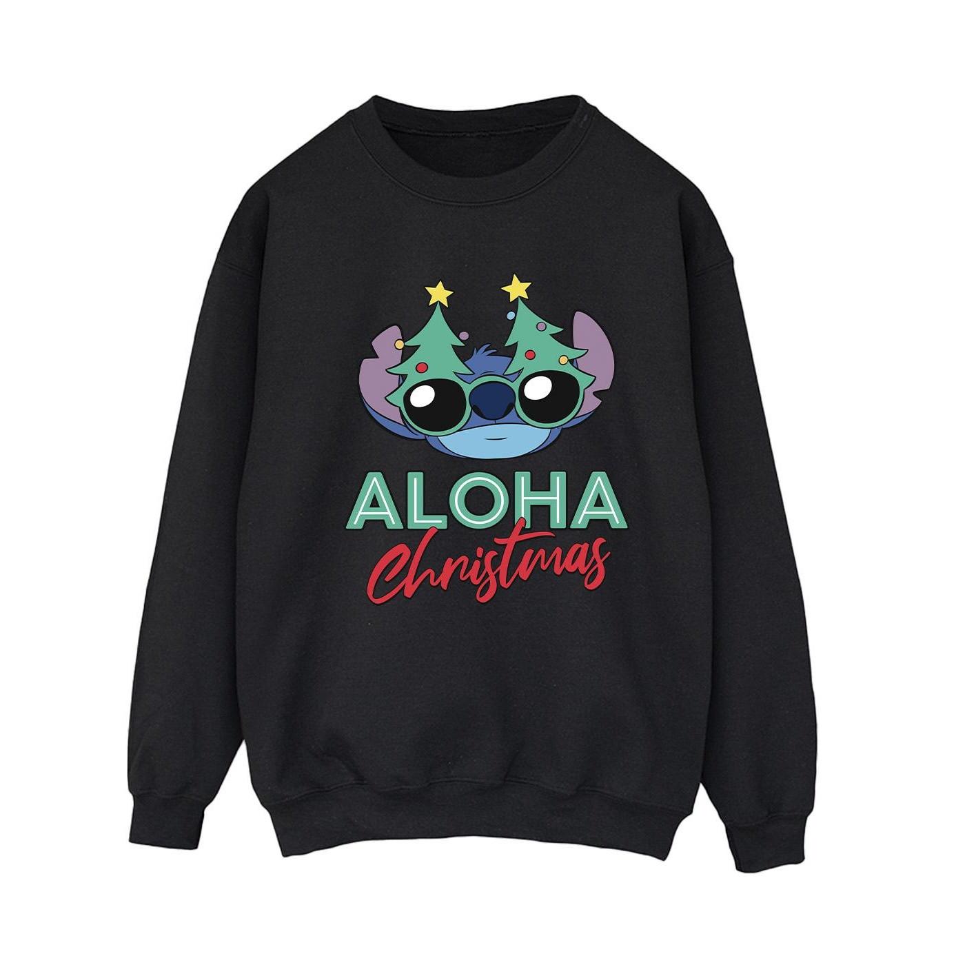 Questa felpa presenta un design festivo "Aloha Christmas" con Stitch che indossa occhiali a forma di albero di Natale. È una scelta comoda ed elegante per le festività natalizie.