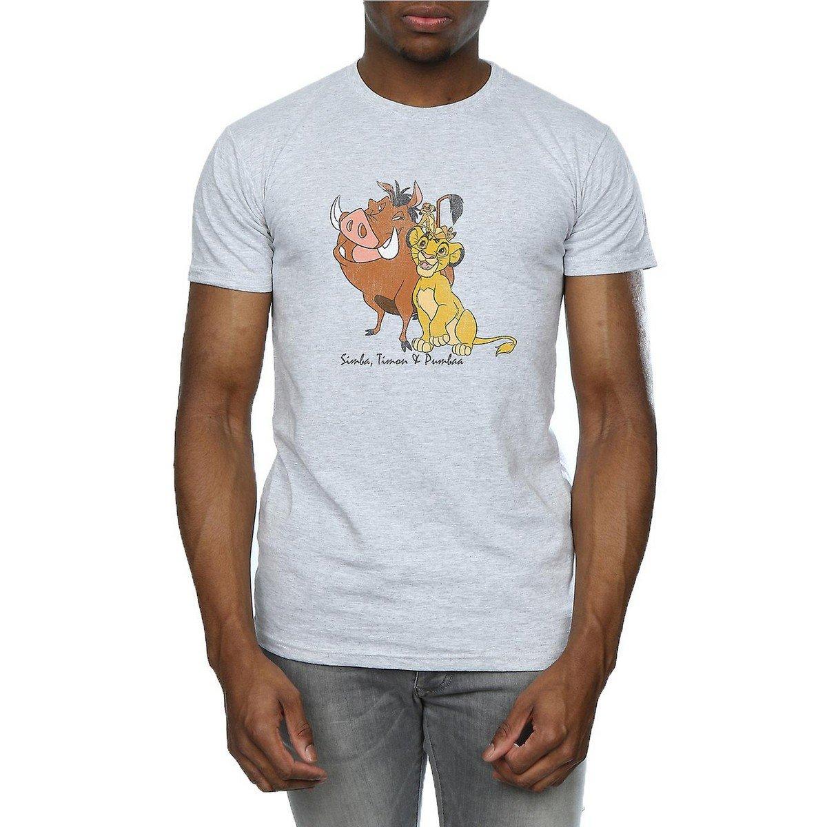 Questa t-shirt classica presenta un'affascinante stampa grafica di Simba, Timon e Pumbaa de Il Re Leone della Disney. Il design confortevole la rende un'aggiunta versatile a qualsiasi guardaroba casual.