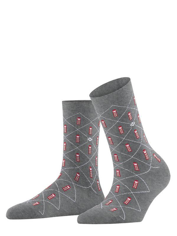 Queste calze presentano un divertente motivo a cabina telefonica, aggiungendo un tocco di stile unico a qualsiasi outfit. Il design è integrato in un classico motivo argyle, offrendo una miscela di estetica tradizionale e stravagante. La scritta Burlington è incorporata nella suola.
