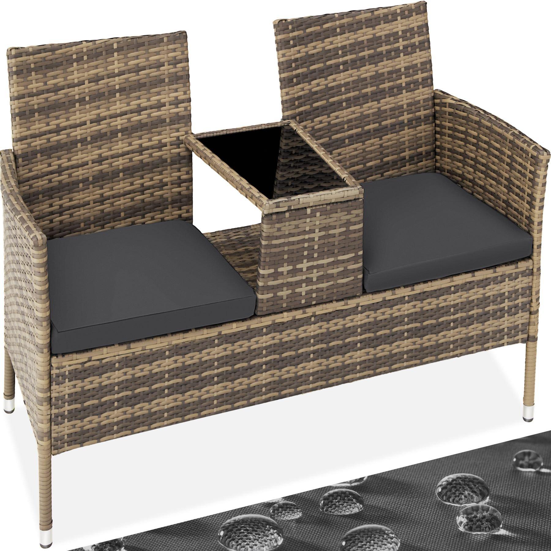 Questa pratica panchina da giardino in polyrattan con i suoi comodi cuscini ti riserverà piacevoli momenti a due nel tuo giardino, in terrazza, sul balcone o in veranda. Il polyrattan è particolarmente indicato per l’uso all’aperto e sin inserisce bene in qualsiasi giardino. I rivestimenti della seduta sono staccabili e lavabili. Un ulteriore vantaggio di questa bella panchina da giardino è il tavolo incorporato al centro. Sull’elegante piano in vetro potrai appoggiare i tuoi drink, un libro o la crema solare.
