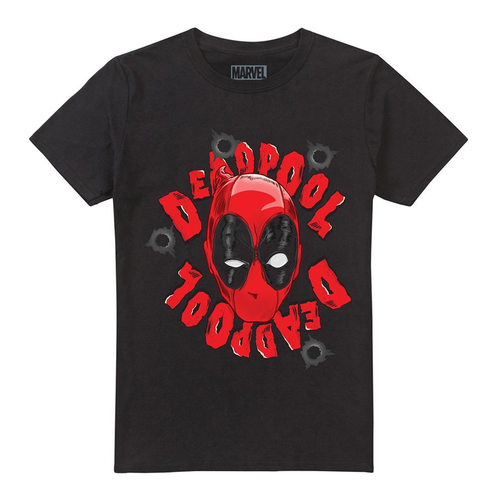 Questa T-shirt presenta una stampa grafica audace dell'iconica maschera di Deadpool, circondata da fori di proiettile e dal nome del personaggio. Il classico girocollo e le maniche corte la rendono un'aggiunta versatile a qualsiasi guardaroba casuale.