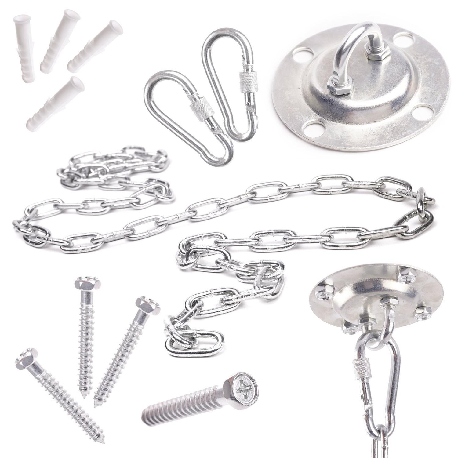 Set di staffe e catene per l'assemblaggio di amache e altalene brasiliane. Dotato di componenti resistenti e durevoli che garantiscono un'elevata capacità di carico. Con questo set, potete decidere voi stessi dove appendere la vostra amaca o altalena. Grazie alla catena con moschettone, regolare l'altezza del sedile è molto facile e veloce.