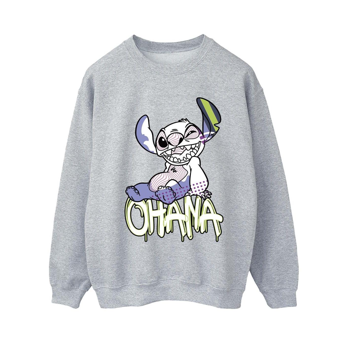 Questa comoda felpa presenta una stampa grafica giocosa di Stitch di Lilo & Stitch della Disney, seduto sulla parola "OHANA". Il design aggiunge un tocco di divertimento e carattere a un capo classico.
