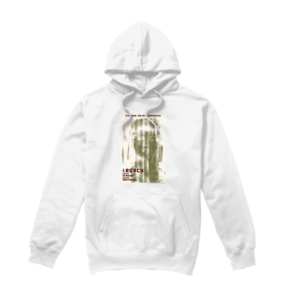 Questa felpa con cappuccio presenta una stampa grafica ispirata a "Star Trek: The Next Generation" Stagione 4 Episodio 6, intitolato "Legacy". Il design mostra un'immagine stilizzata con il titolo dell'episodio e nomi chiave, rendendola un pezzo distintivo per i fan.
