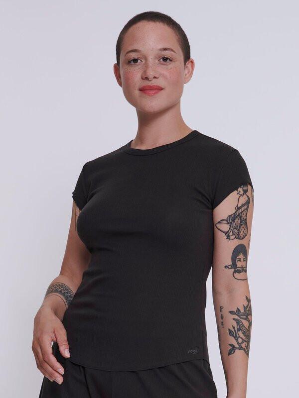 Questa maglietta a coste offre un'opzione comoda ed elegante per l'uso quotidiano. Il design presenta un girocollo alto e maniche a cappuccio, rendendola un'aggiunta versatile a qualsiasi guardaroba.