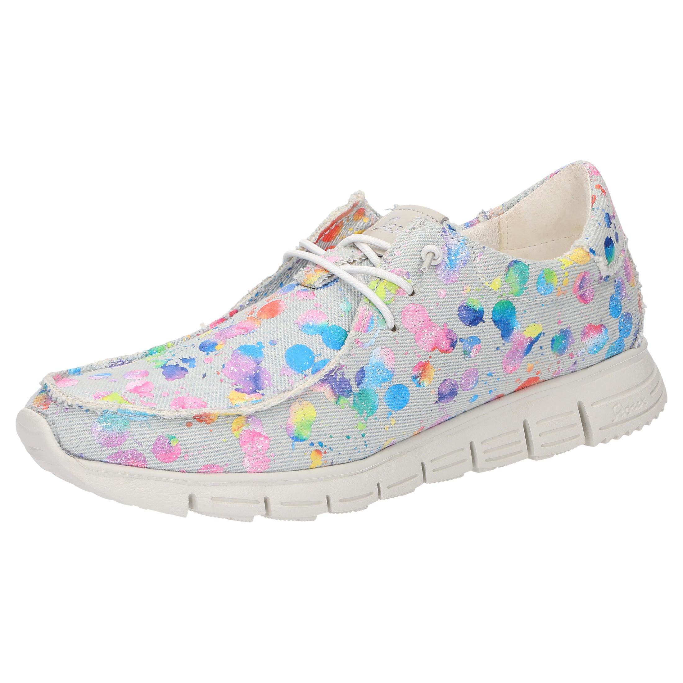 La scarpa stringata Mokrunner-D-007 presenta una tomaia in denim tessile stampato colorato. È morbida, flessibile e leggera per l'estate, rendendola la scarpa perfetta da indossare a piedi nudi durante la stagione calda. I lacci elastici in gomma e il plantare morbido intercambiabile garantiscono una calzata perfetta. L'esclusiva suola MokRunner la rende ultraleggera e super flessibile.
