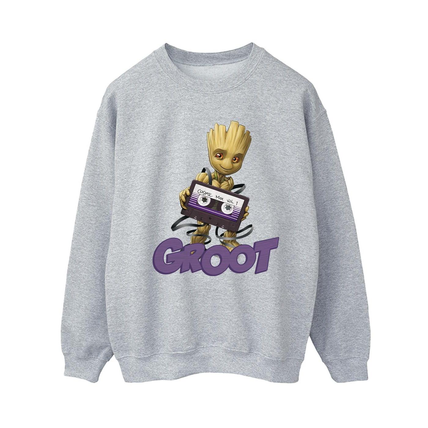 Questa felpa presenta una stampa grafica di Groot che tiene una cassetta, con la parola "GROOT" stampata sotto. È un'opzione comoda ed elegante per l'abbigliamento casual.