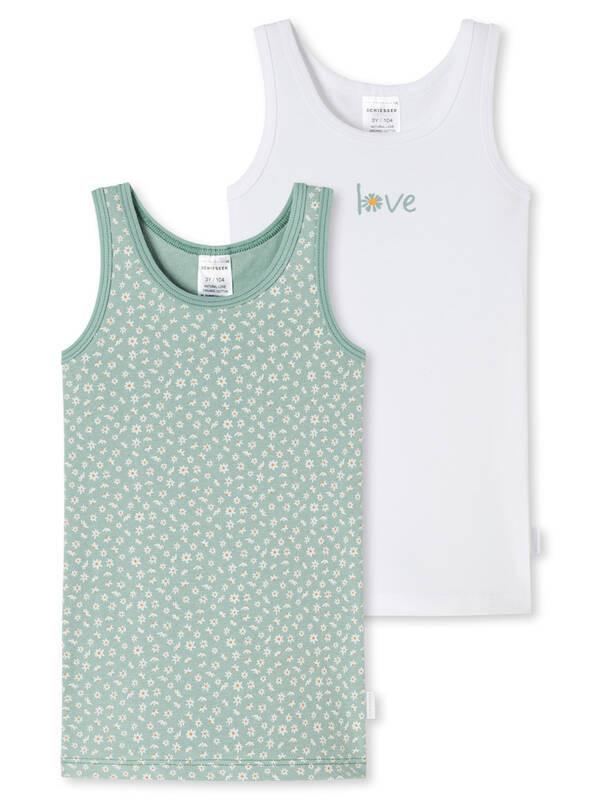 Canotte da bambina in una pratica confezione doppia, verde con motivo margarite bianco e bianca con scritta "love