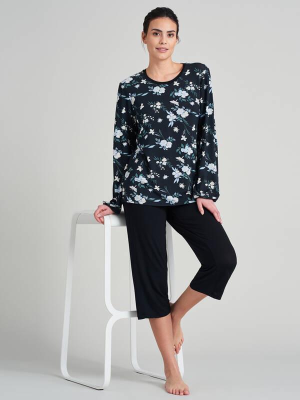 Questo pigiama offre comfort e stile per rilassarsi a casa. La maglia a maniche lunghe presenta un'elegante stampa floreale, polsini stretti, un girocollo bordato e un orlo arrotondato. I pantaloni a 3/4 hanno un taglio ampio e una cintura elastica con stampa floreale, garantendo puro benessere.