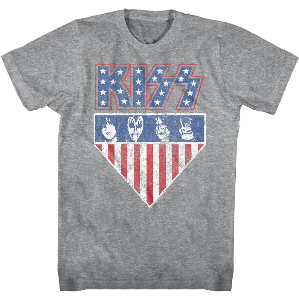 Questa T-shirt con stampa grafica presenta un classico girocollo e maniche corte, offrendo una vestibilità comoda e versatile. Il design mostra l'iconico logo Kiss con un motivo a stelle, posizionato sopra una rappresentazione dei membri della band e un motivo a strisce della bandiera americana.